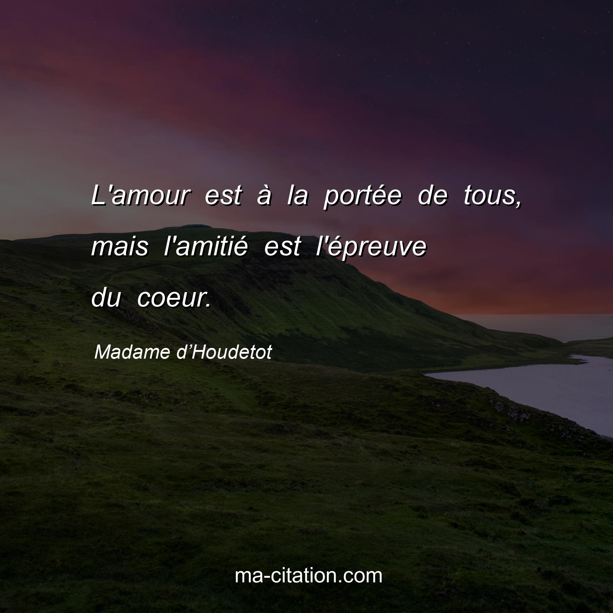 Citation sur l'amitié de Madame d’Houdetot :L'amour est à la portée de tous, mais l'amitié est l'épreuve du coeur.