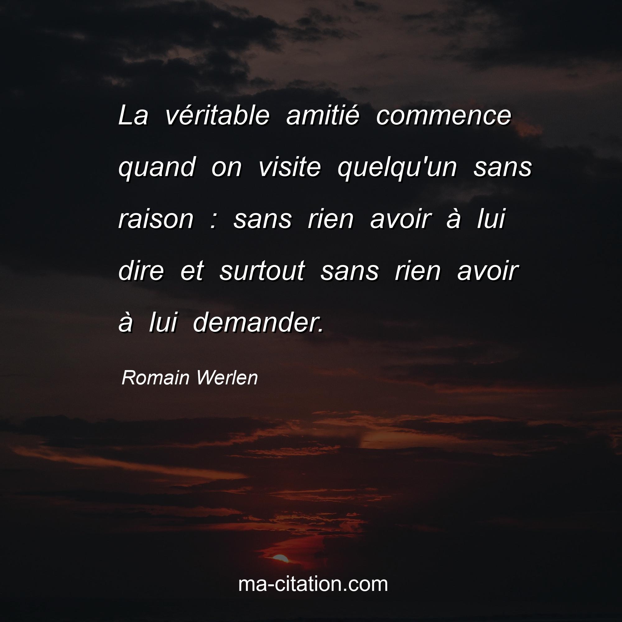 Romain Werlen est l'auteur de la citation sur l'amitié "La véritable amitié commence quand on visite quelqu'un sans raison : sans rien avoir à lui dire et surtout sans rien avoir à lui demander.".