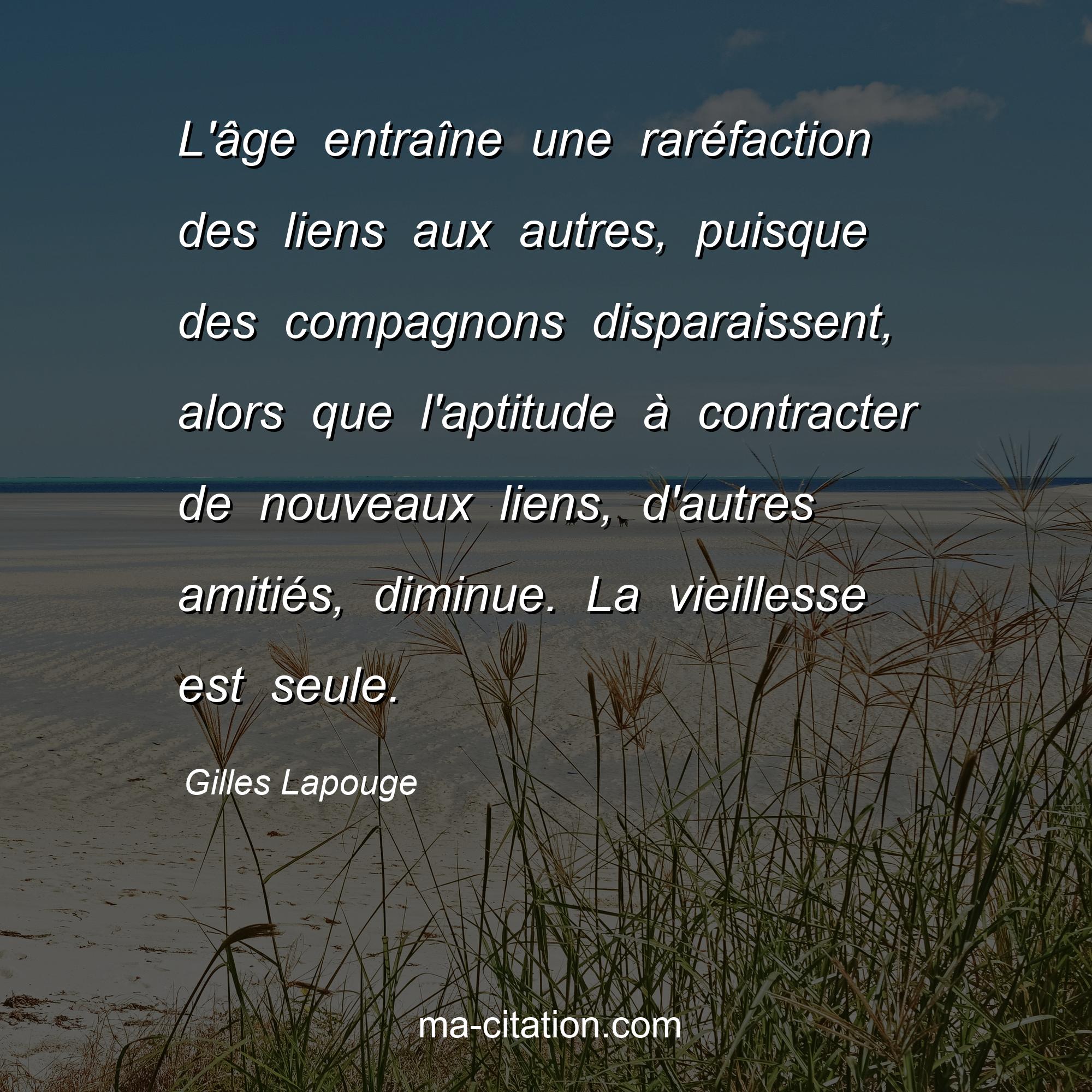 Citation sur l'amitié de Gilles Lapouge :L'âge entraîne une raréfaction des liens aux autres, puisque des compagnons disparaissent, alors que l'aptitude à contracter de nouveaux liens, d'autres amitiés, diminue. La vieillesse est seule.