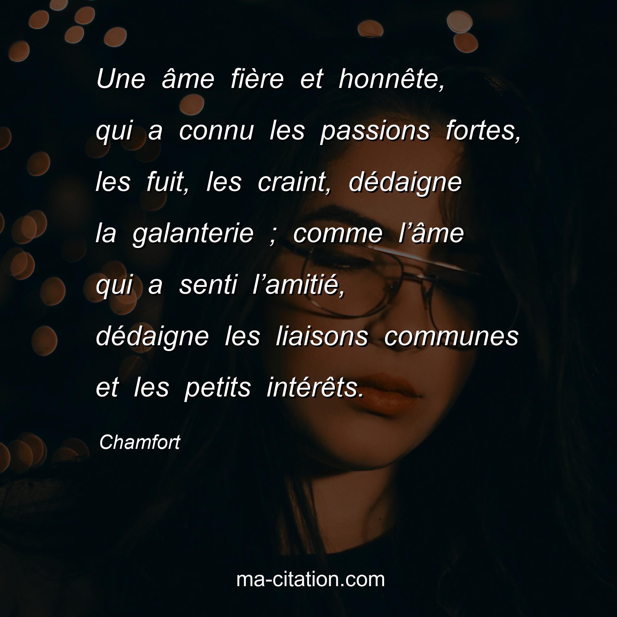 Citation sur l'amitié de Chamfort :Une âme fière et honnête, qui a connu les passions fortes, les fuit, les craint, dédaigne la galanterie ; comme l’âme qui a senti l’amitié, dédaigne les liaisons communes et les petits intérêts.