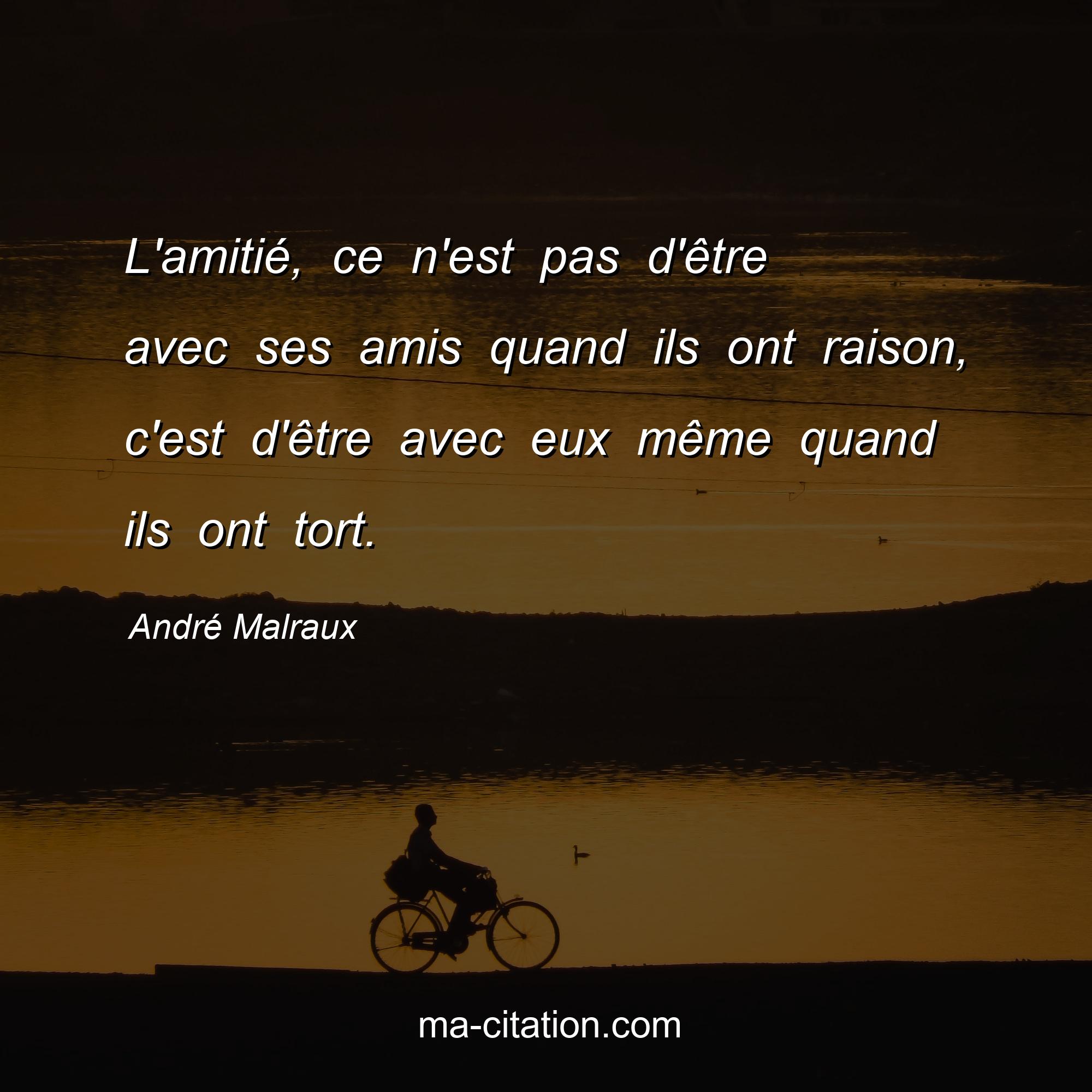 Citation sur l'amitié d'André Malraux :L'amitié, ce n'est pas d'être avec ses amis quand ils ont raison, c'est d'être avec eux même quand ils ont tort.