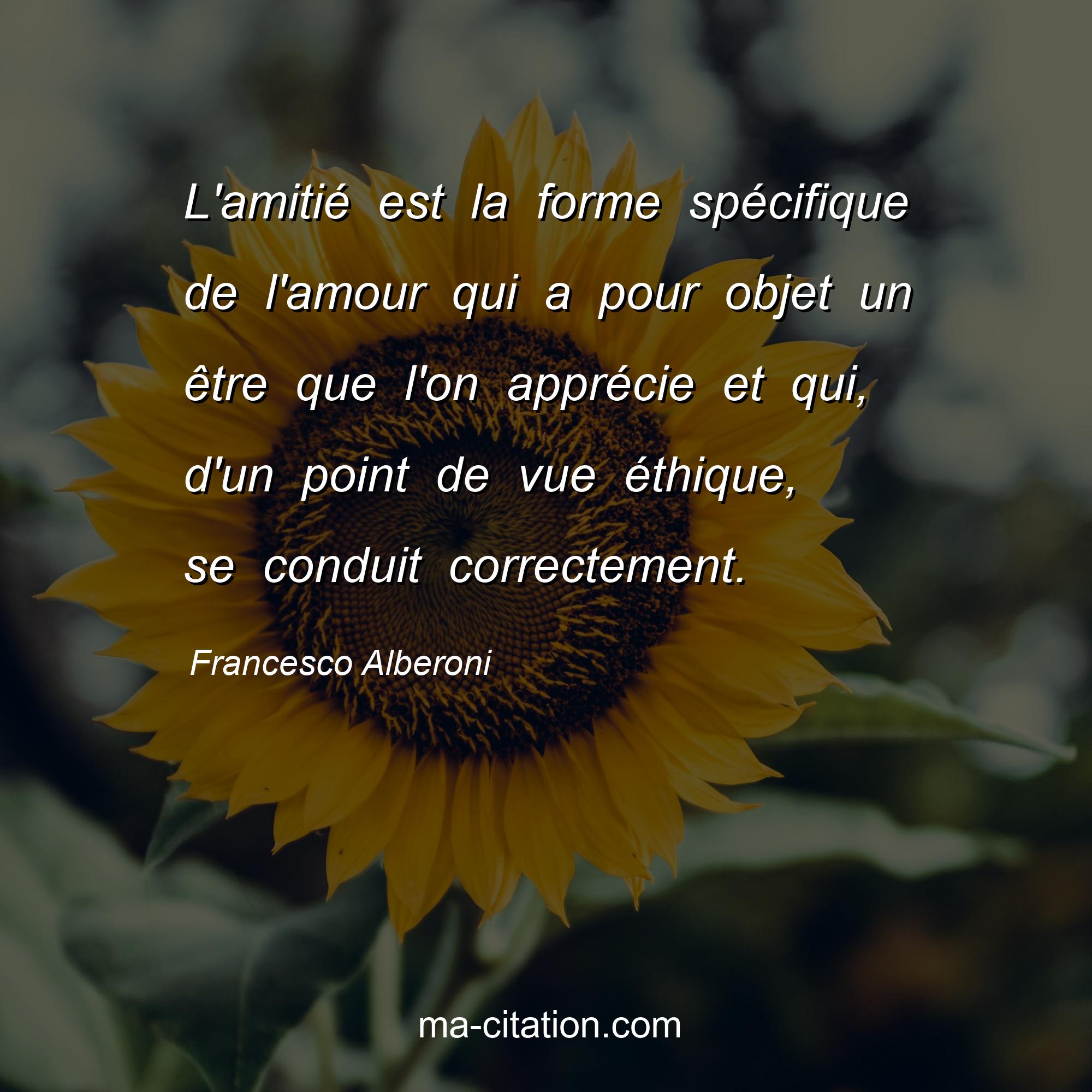 Citation sur l'amitié de Francesco Alberoni :L'amitié est la forme spécifique de l'amour qui a pour objet un être que l'on apprécie et qui, d'un point de vue éthique, se conduit correctement.