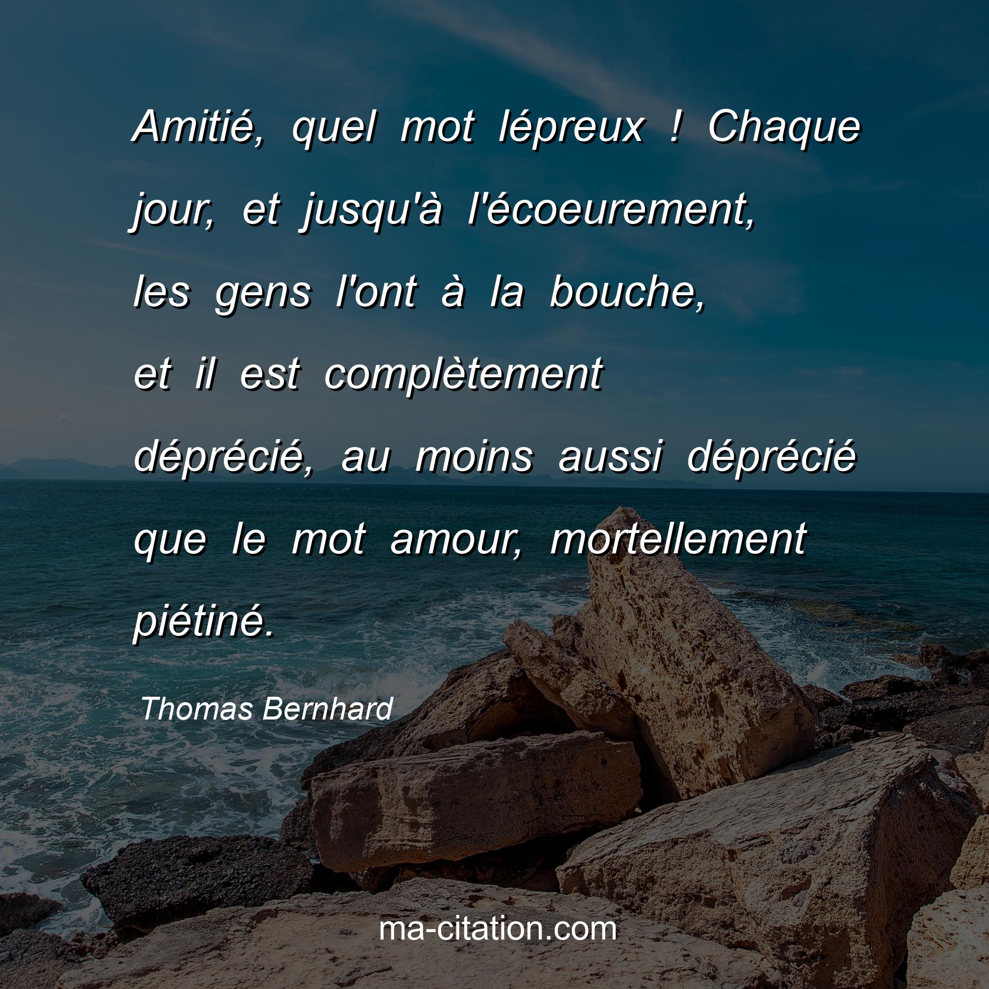 Thomas Bernhard est l'auteur de la citation sur l'amitié "Amitié, quel mot lépreux ! Chaque jour, et jusqu'à l'écoeurement, les gens l'ont à la bouche, et il est complètement déprécié, au moins aussi déprécié que le mot amour, mortellement piétiné.".