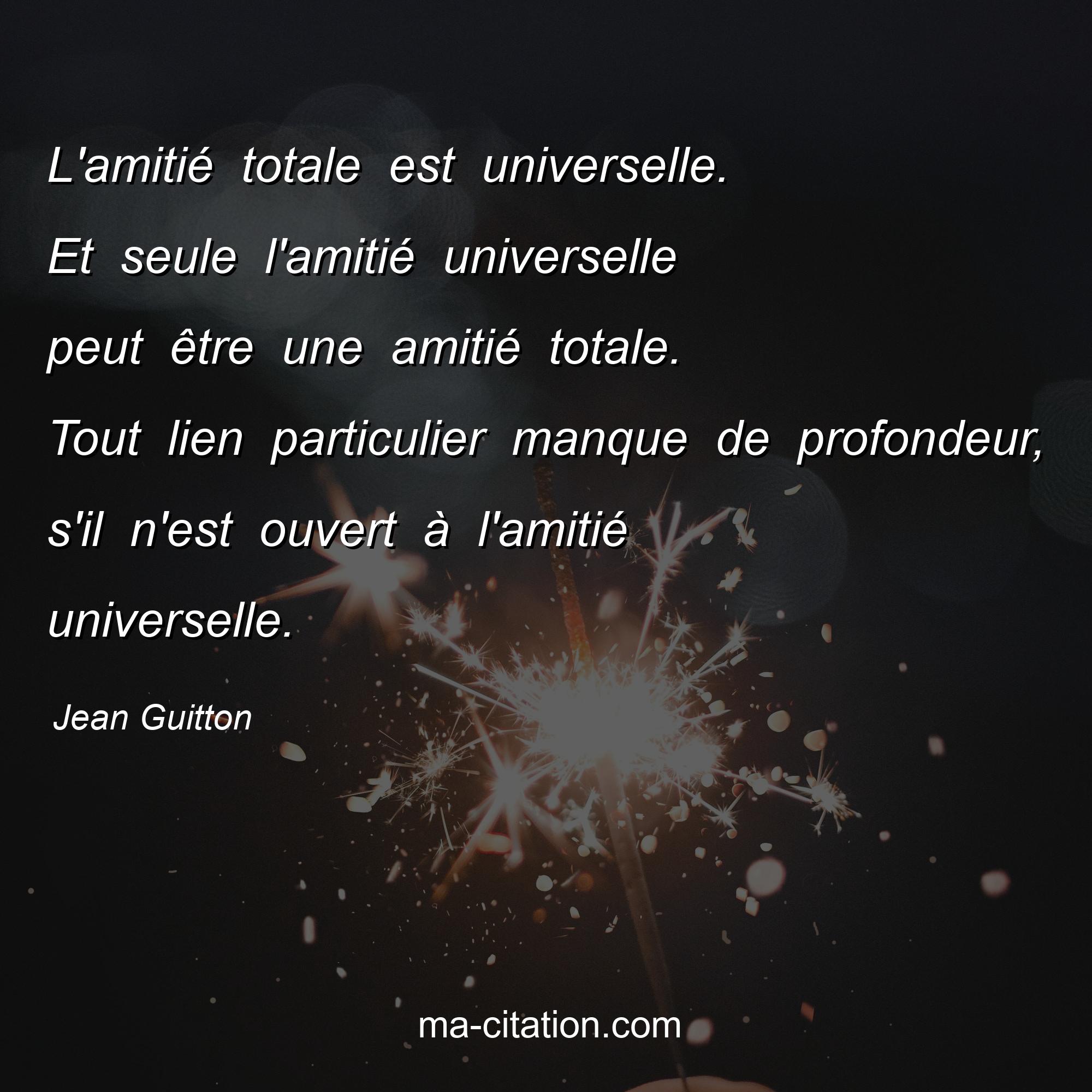 Citation sur l'amitié de Jean Guitton :L'amitié totale est universelle. Et seule l'amitié universelle peut être une amitié totale. Tout lien particulier manque de profondeur, s'il n'est ouvert à l'amitié universelle.