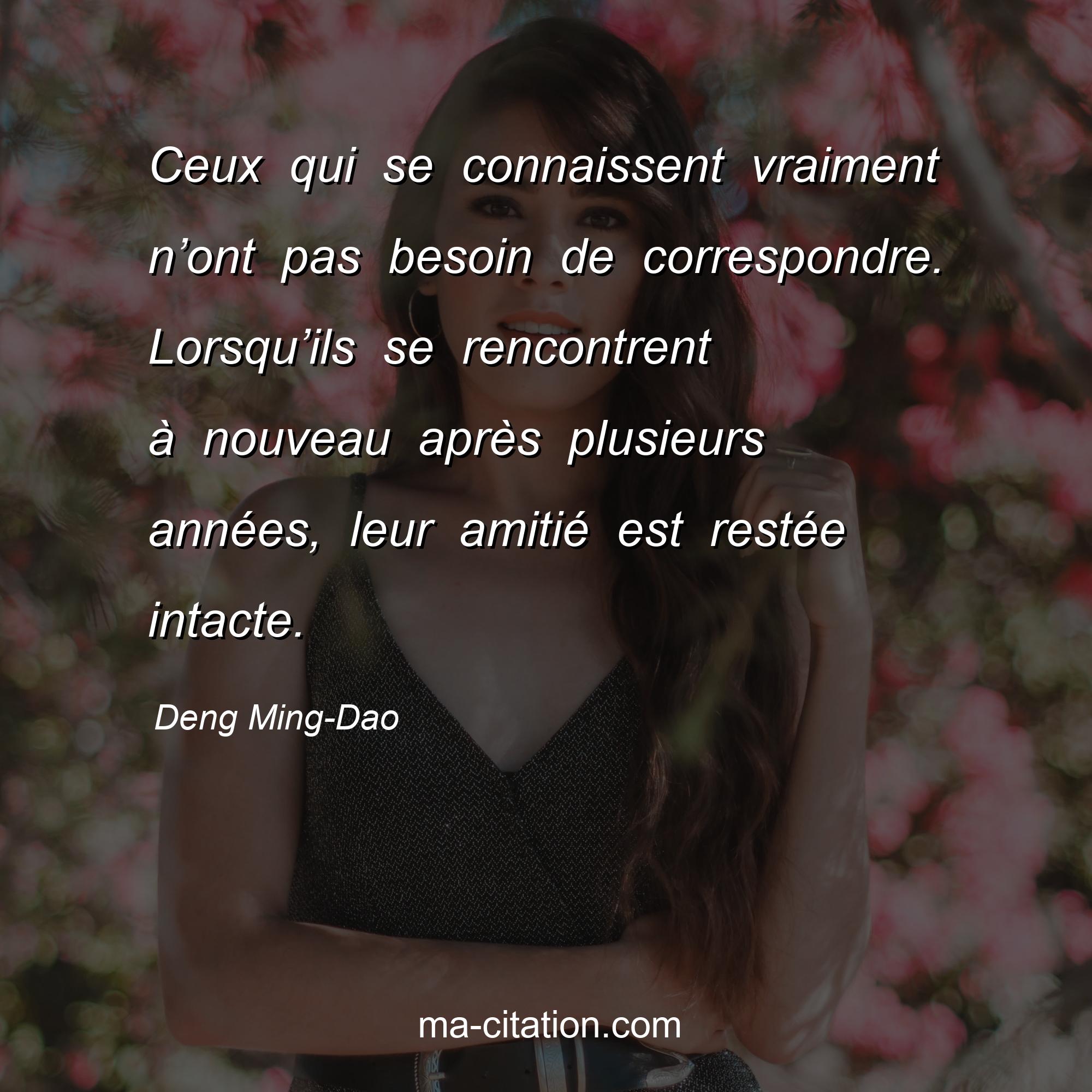 Deng Ming-Dao est l'auteur de la citation sur l'amitié "Ceux qui se connaissent vraiment n’ont pas besoin de correspondre. Lorsqu’ils se rencontrent à nouveau après plusieurs années, leur amitié est restée intacte.".