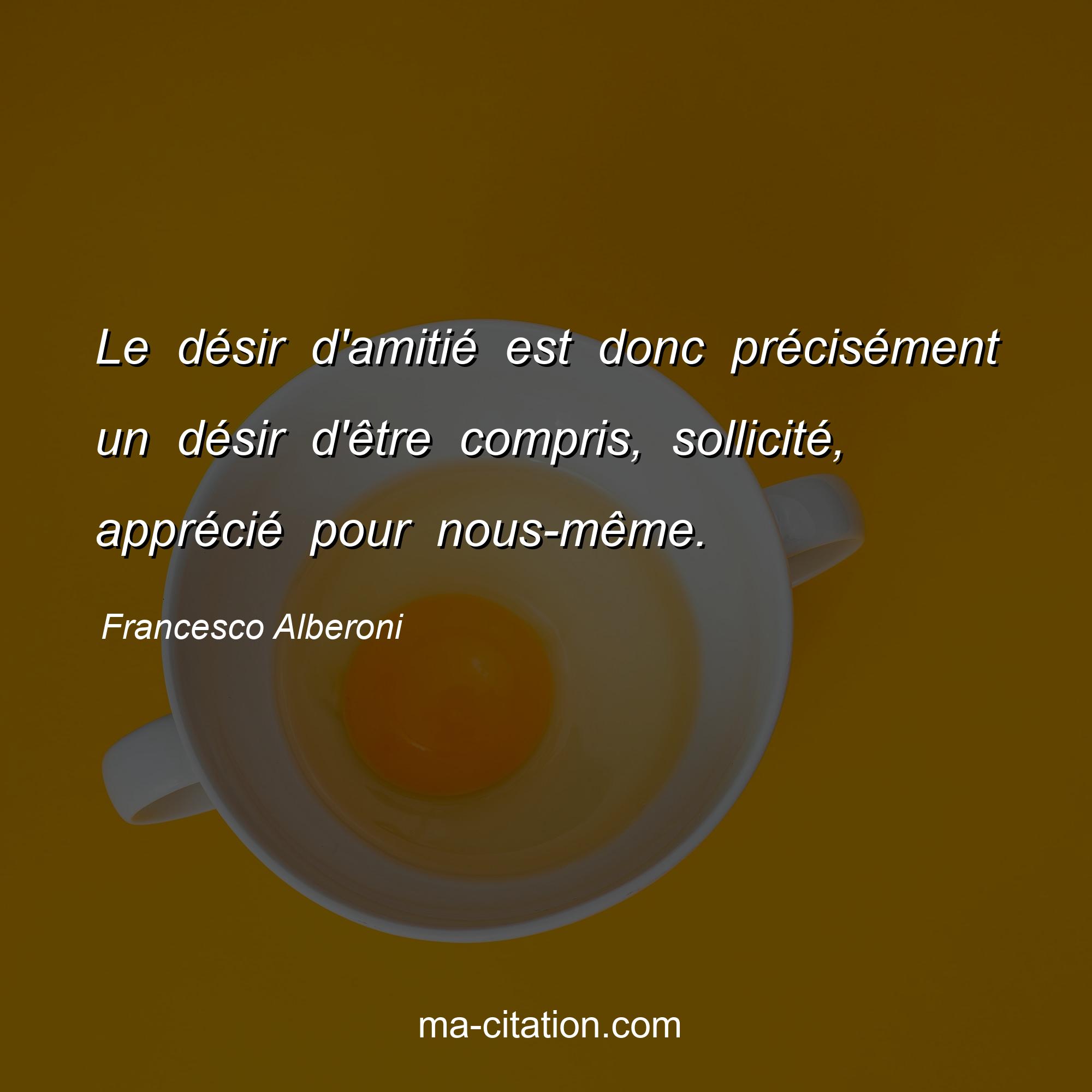 Citation sur l'amitié de Francesco Alberoni :Le désir d'amitié est donc précisément un désir d'être compris, sollicité, apprécié pour nous-même.