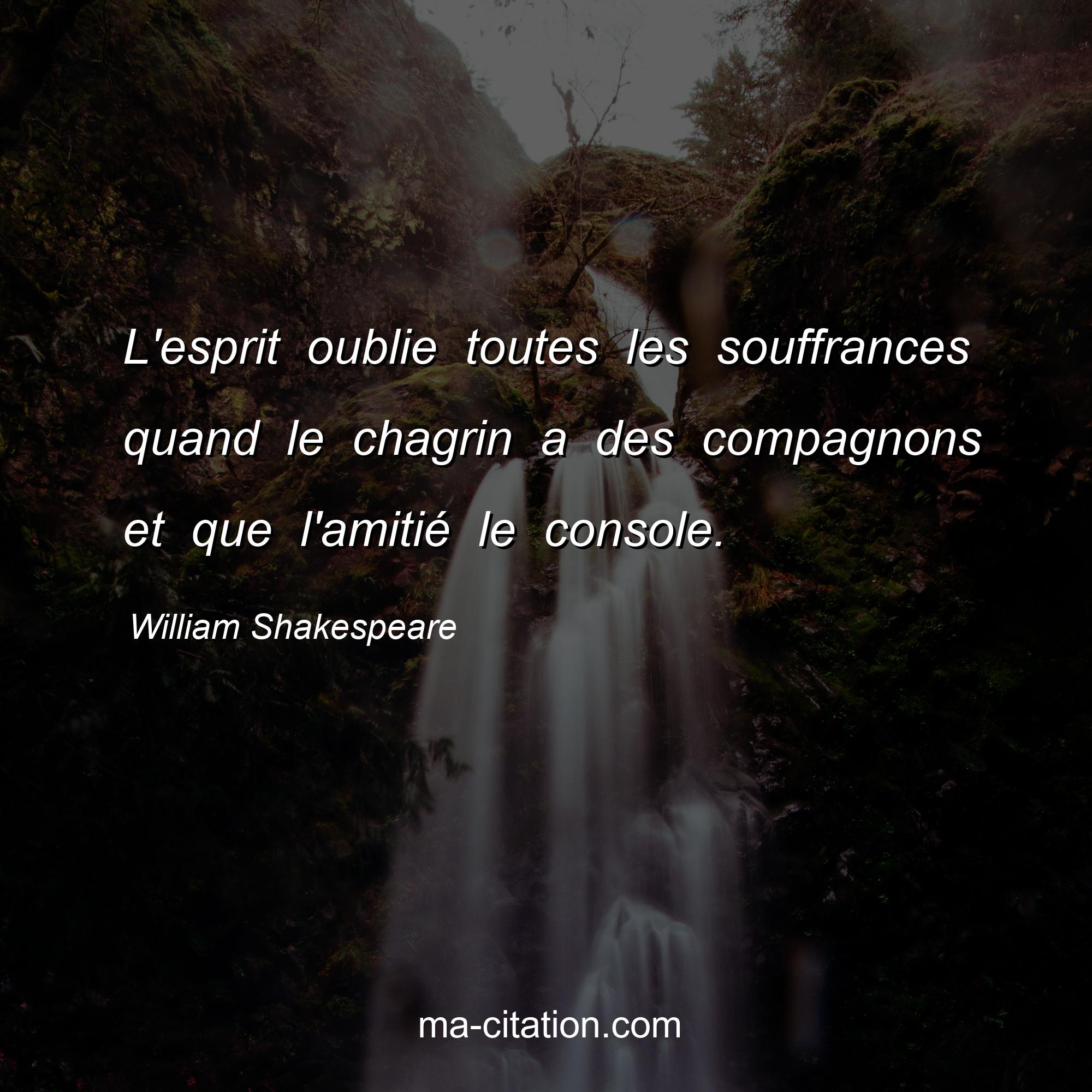 Citation sur l'amitié de William Shakespeare :L'esprit oublie toutes les souffrances quand le chagrin a des compagnons et que l'amitié le console.