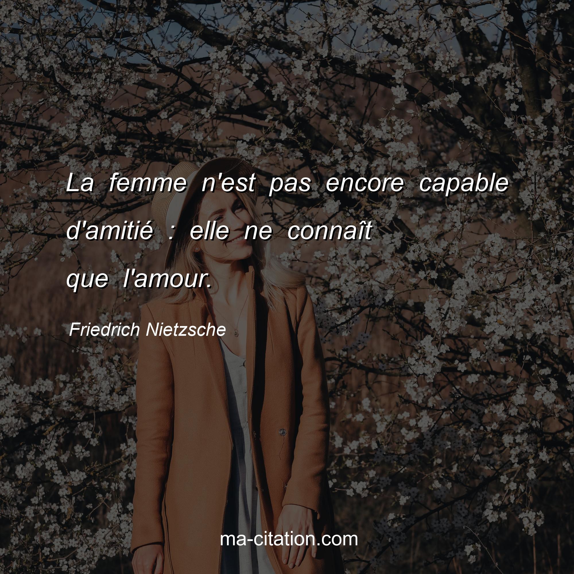 Citation sur l'amitié de Friedrich Nietzsche :La femme n'est pas encore capable d'amitié : elle ne connaît que l'amour.