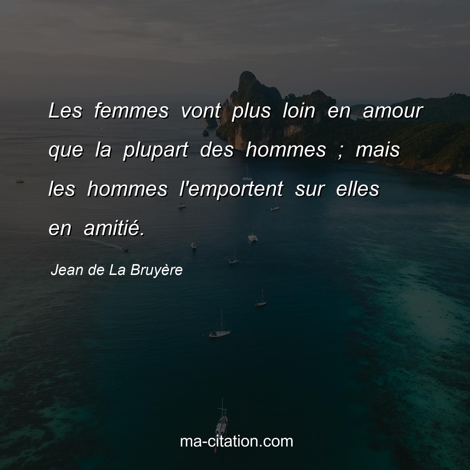 Jean de La Bruyère : Les femmes vont plus loin en amour que la plupart des hommes ; mais les hommes l'emportent sur elles en amitié.