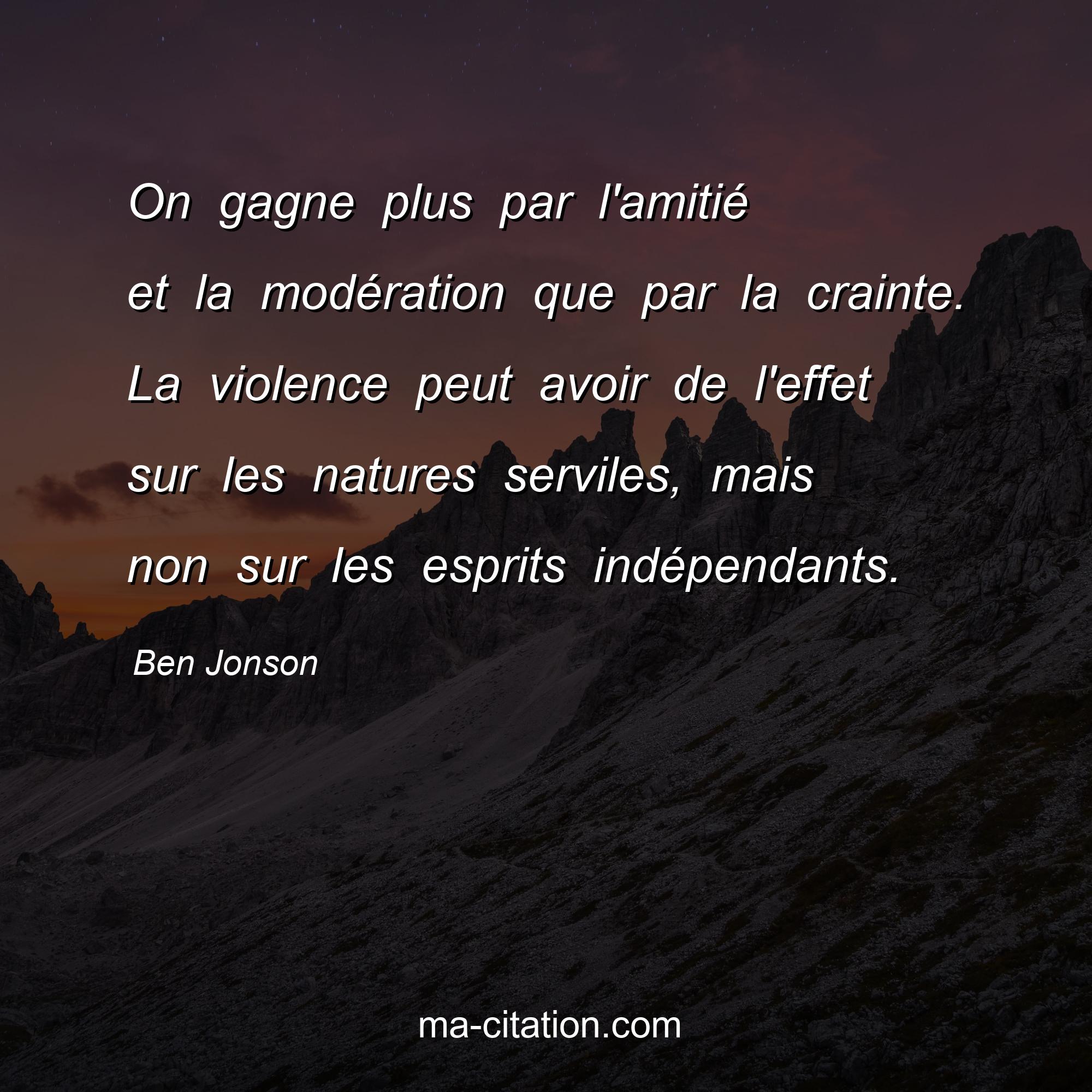 Citation sur l'amitié de Ben Jonson :On gagne plus par l'amitié et la modération que par la crainte. La violence peut avoir de l'effet sur les natures serviles, mais non sur les esprits indépendants.