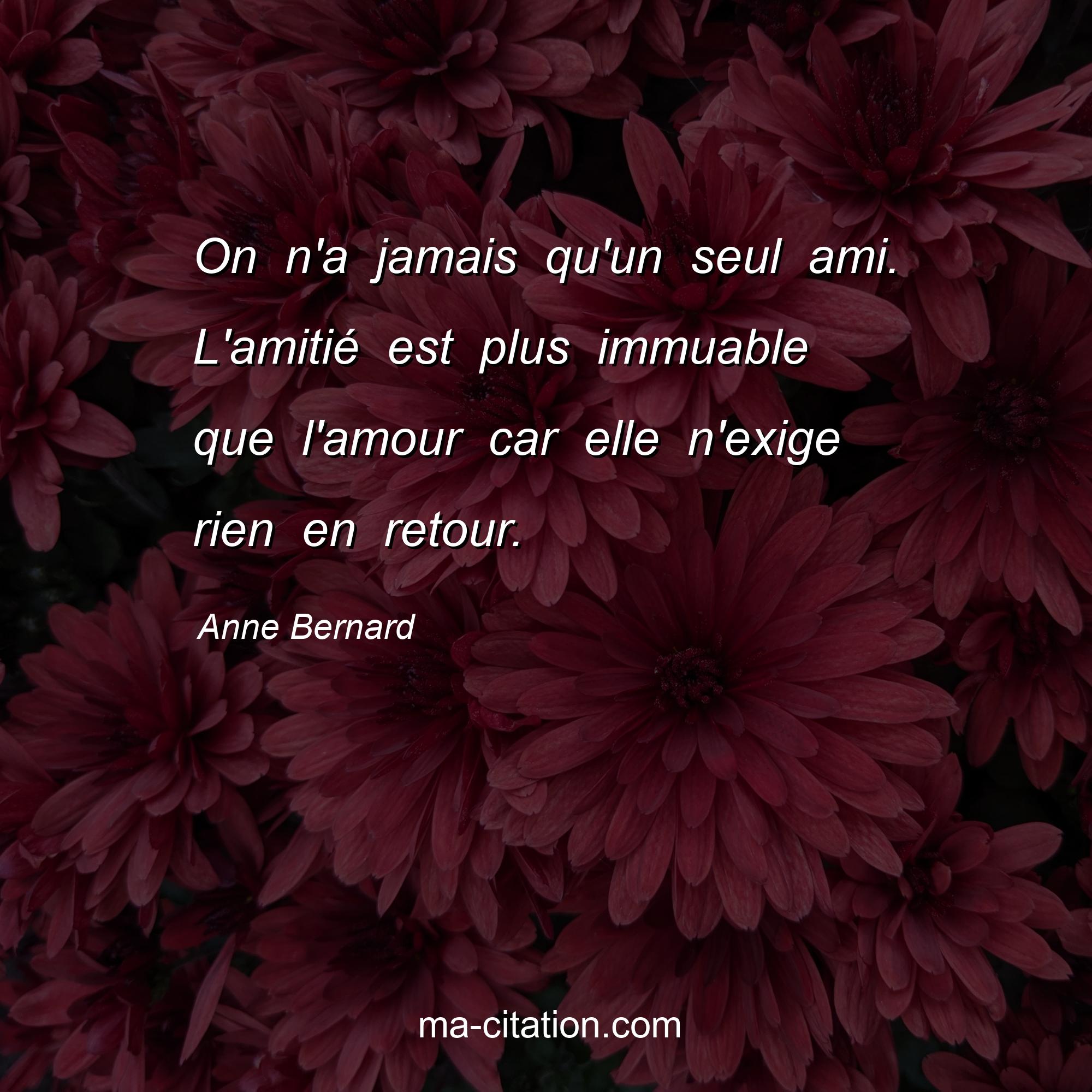 Citation sur l'amitié d'Anne Bernard :On n'a jamais qu'un seul ami. L'amitié est plus immuable que l'amour car elle n'exige rien en retour.