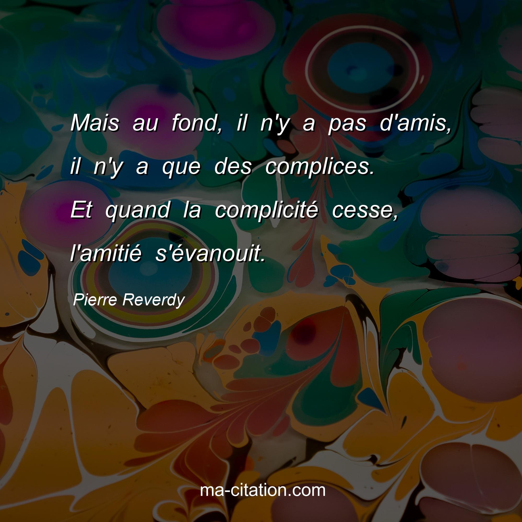Citation sur l'amitié de Pierre Reverdy :Mais au fond, il n'y a pas d'amis, il n'y a que des complices. Et quand la complicité cesse, l'amitié s'évanouit.