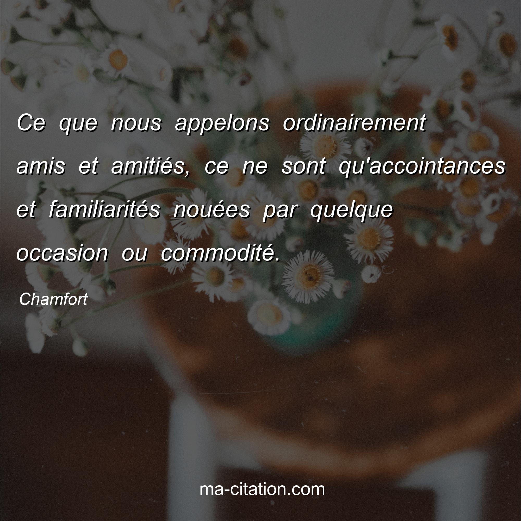 Citation sur l'amitié de Chamfort :Ce que nous appelons ordinairement amis et amitiés, ce ne sont qu'accointances et familiarités nouées par quelque occasion ou commodité.