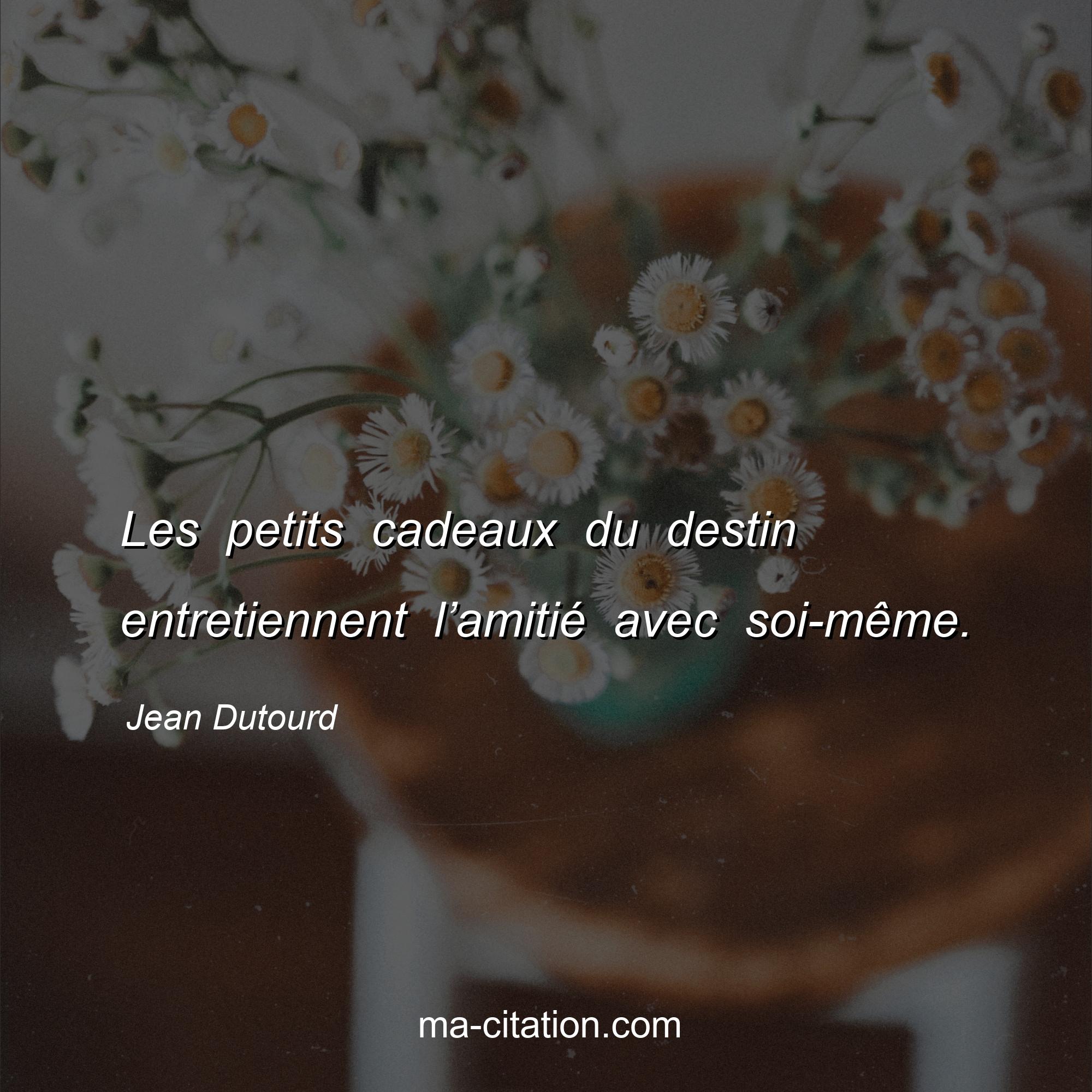 Citation sur l'amitié de Jean Dutourd :Les petits cadeaux du destin entretiennent l’amitié avec soi-même.