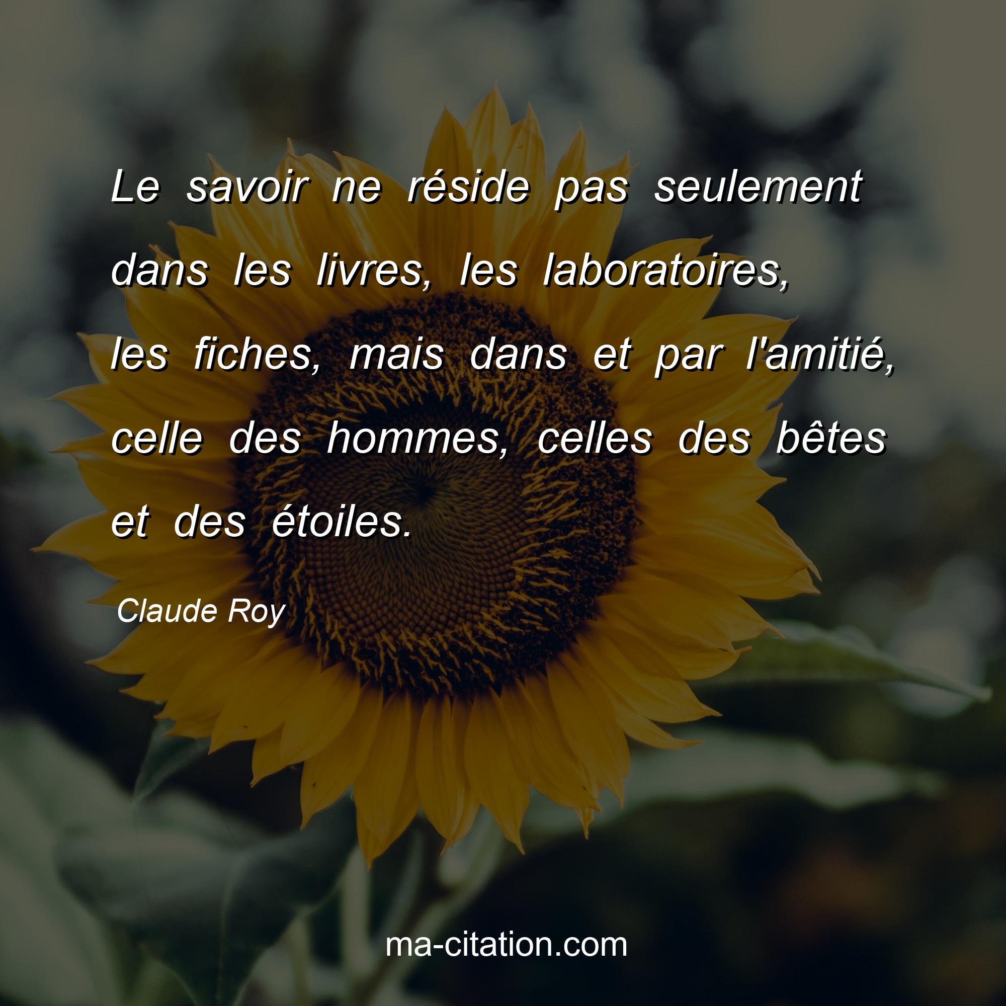 Claude Roy est l'auteur de la citation sur l'amitié "Le savoir ne réside pas seulement dans les livres, les laboratoires, les fiches, mais dans et par l'amitié, celle des hommes, celles des bêtes et des étoiles.".