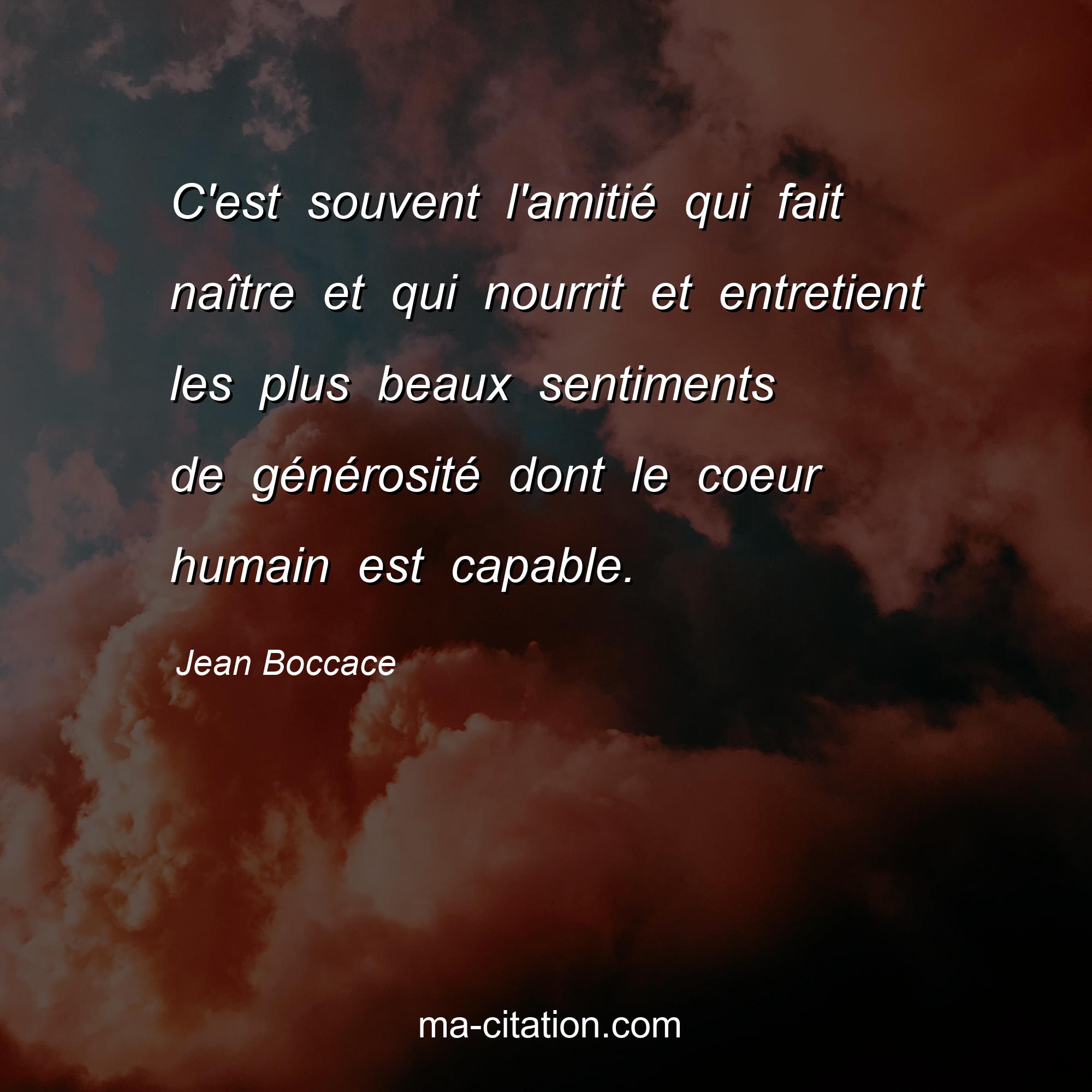 Jean Boccace est l'auteur de la citation sur l'amitié "C'est souvent l'amitié qui fait naître et qui nourrit et entretient les plus beaux sentiments de générosité dont le coeur humain est capable.".