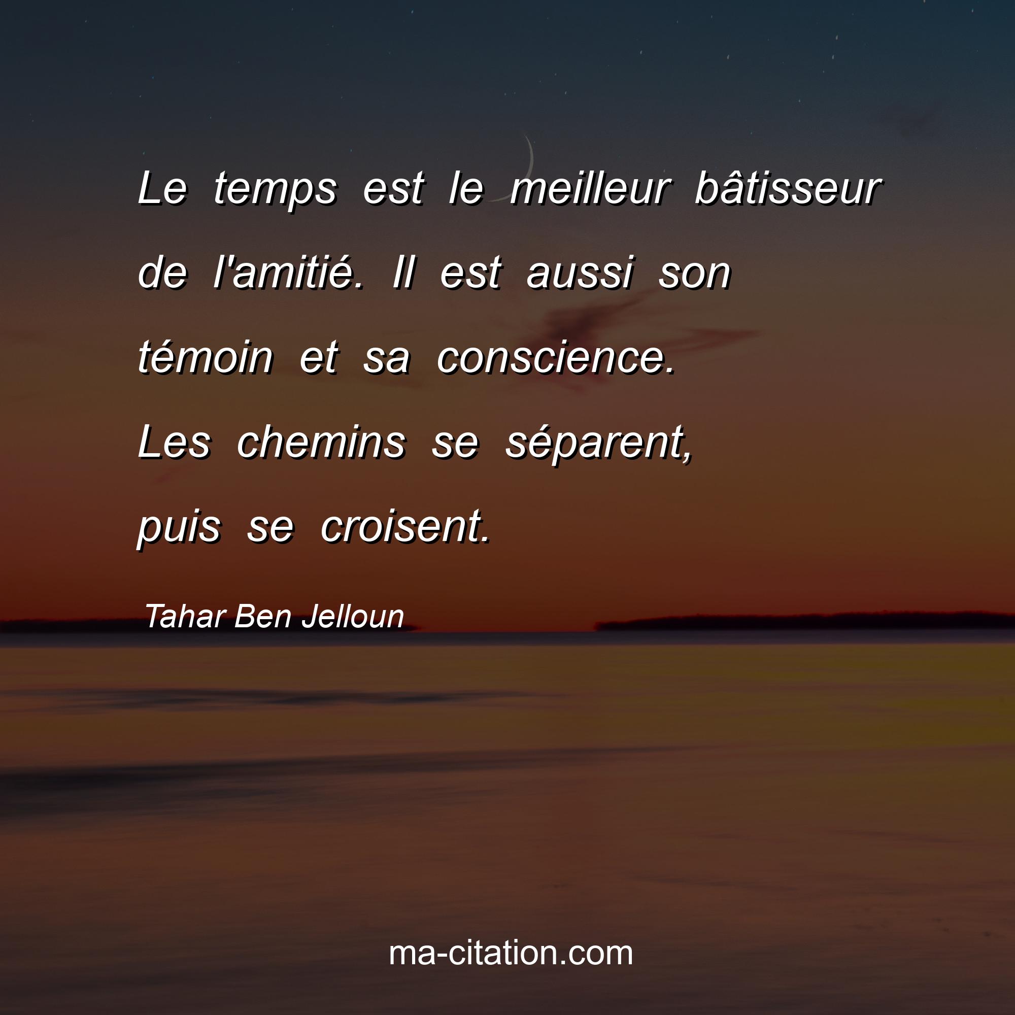 Citation sur l'amitié de Tahar Ben Jelloun :Le temps est le meilleur bâtisseur de l'amitié. Il est aussi son témoin et sa conscience. Les chemins se séparent, puis se croisent.