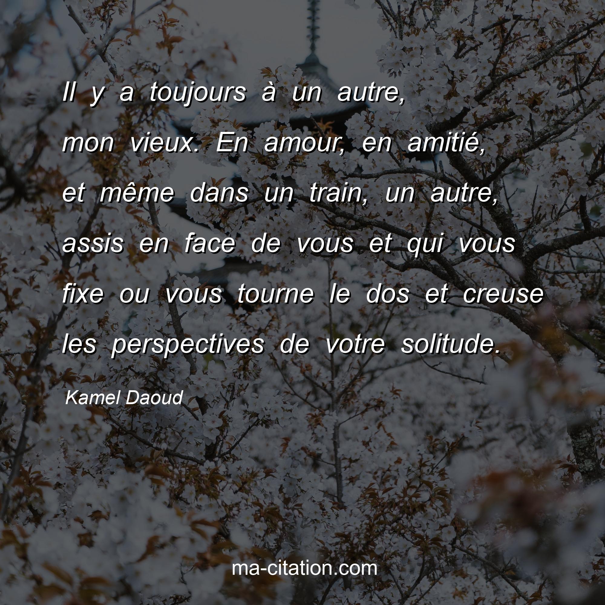Citation sur l'amitié de Kamel Daoud :Il y a toujours à un autre, mon vieux. En amour, en amitié, et même dans un train, un autre, assis en face de vous et qui vous fixe ou vous tourne le dos et creuse les perspectives de votre solitude.