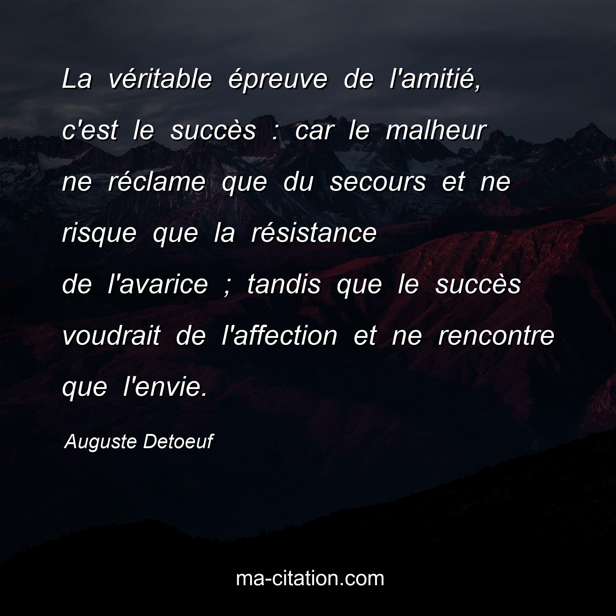 Auguste Detoeuf : La véritable épreuve de l'amitié, c'est le succès : car le malheur ne réclame que du secours et ne risque que la résistance de l'avarice ; tandis que le succès voudrait de l'affection et ne rencontre que l'envie.