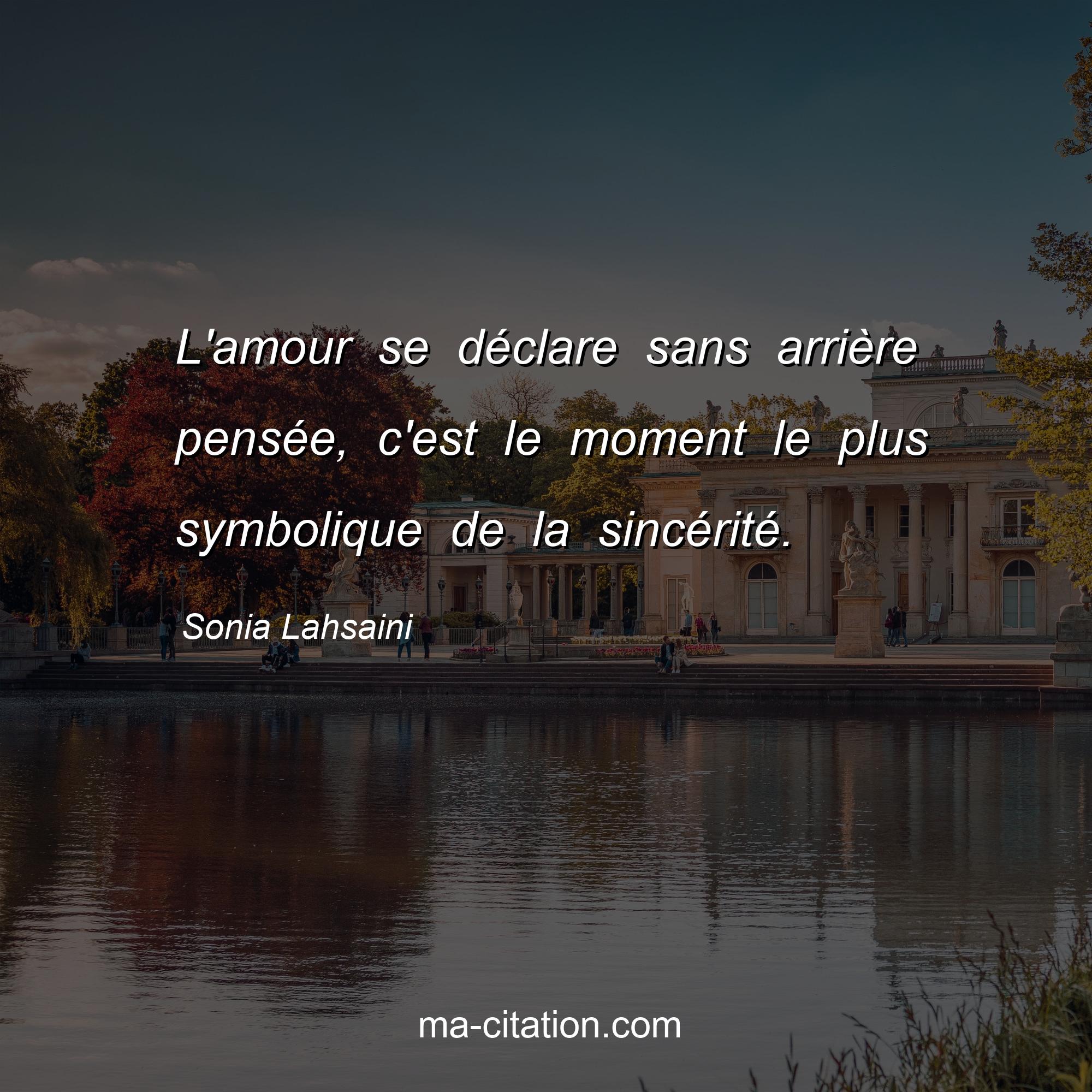 Sonia Lahsaini est l'auteur de la citation sur l'amour "L'amour se déclare sans arrière pensée, c'est le moment le plus symbolique de la sincérité.".