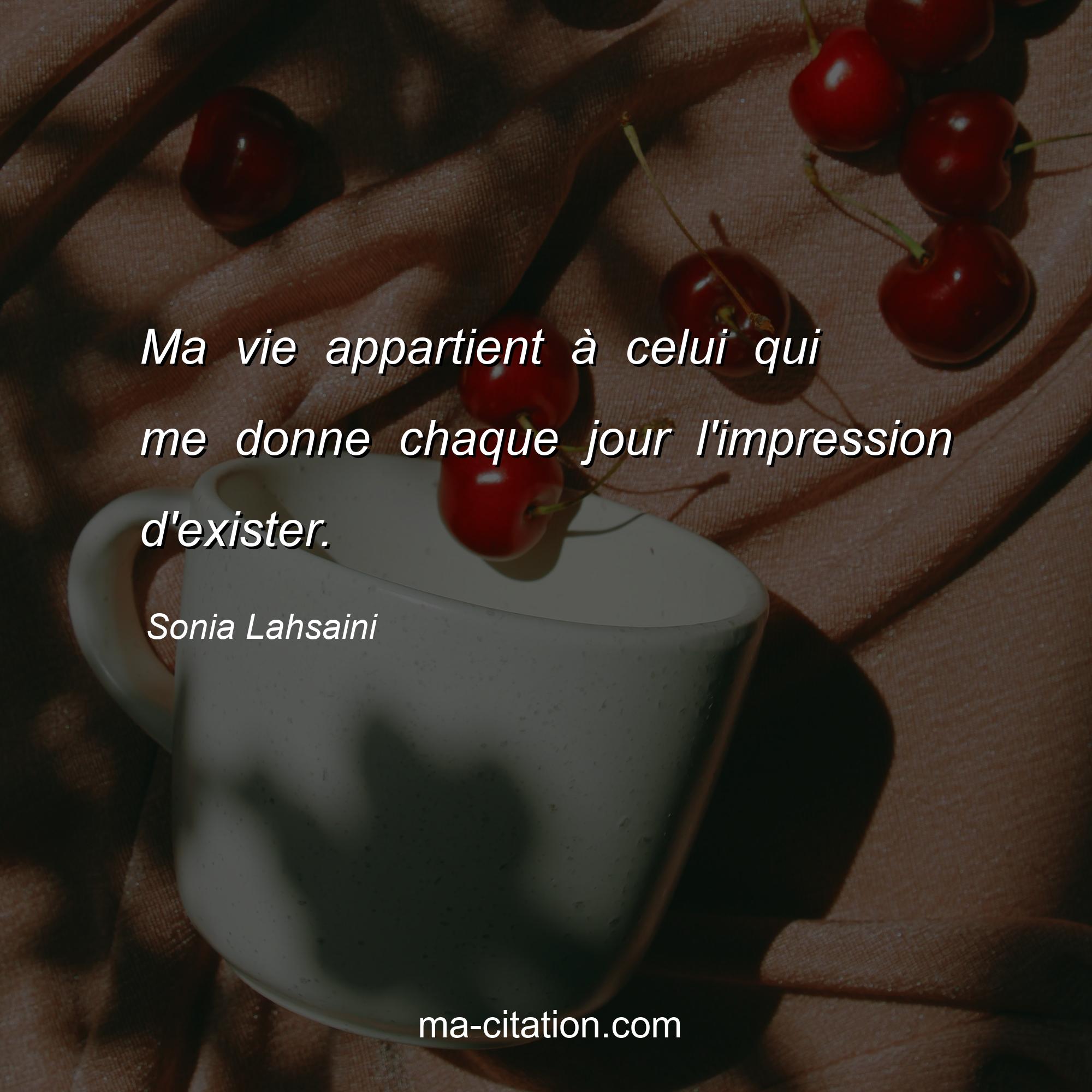 Sonia Lahsaini est l'auteur de la citation sur l'amour "Ma vie appartient à celui qui me donne chaque jour l'impression d'exister.".