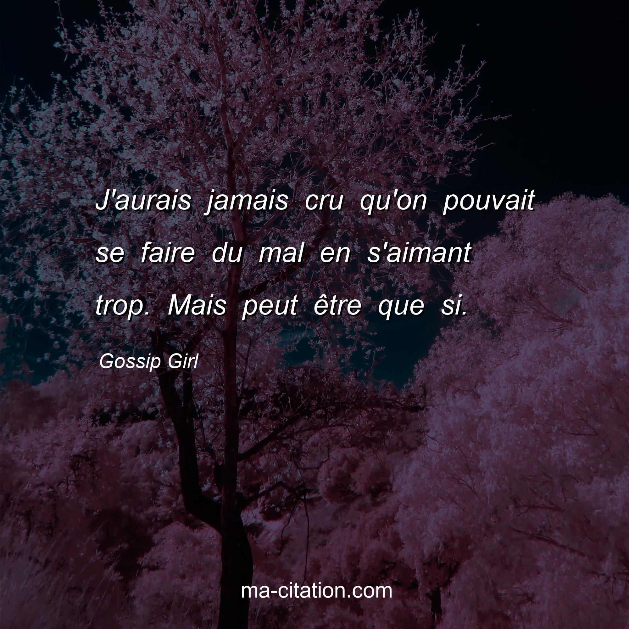 Gossip Girl est l'auteur de la citation sur l'amour "J'aurais jamais cru qu'on pouvait se faire du mal en s'aimant trop. Mais peut être que si.".