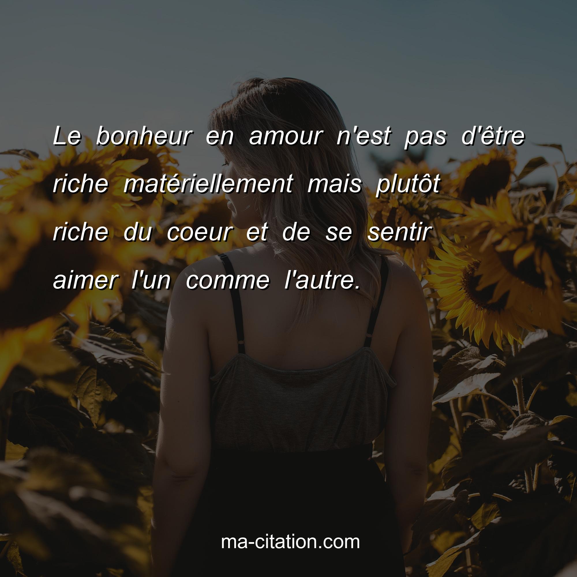 Citation sur l'amour :Le bonheur en amour n'est pas d'être riche matériellement mais plutôt riche du coeur et de se sentir aimer l'un comme l'autre.