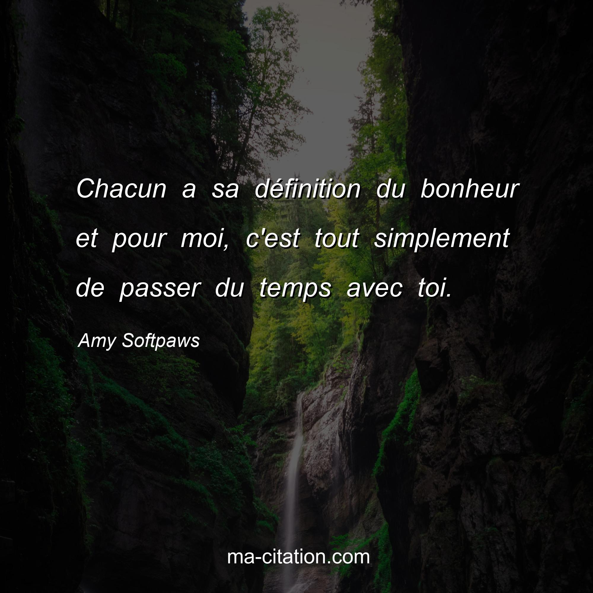 Citation sur l'amour d'Amy Softpaws :Chacun a sa définition du bonheur et pour moi, c'est tout simplement de passer du temps avec toi.