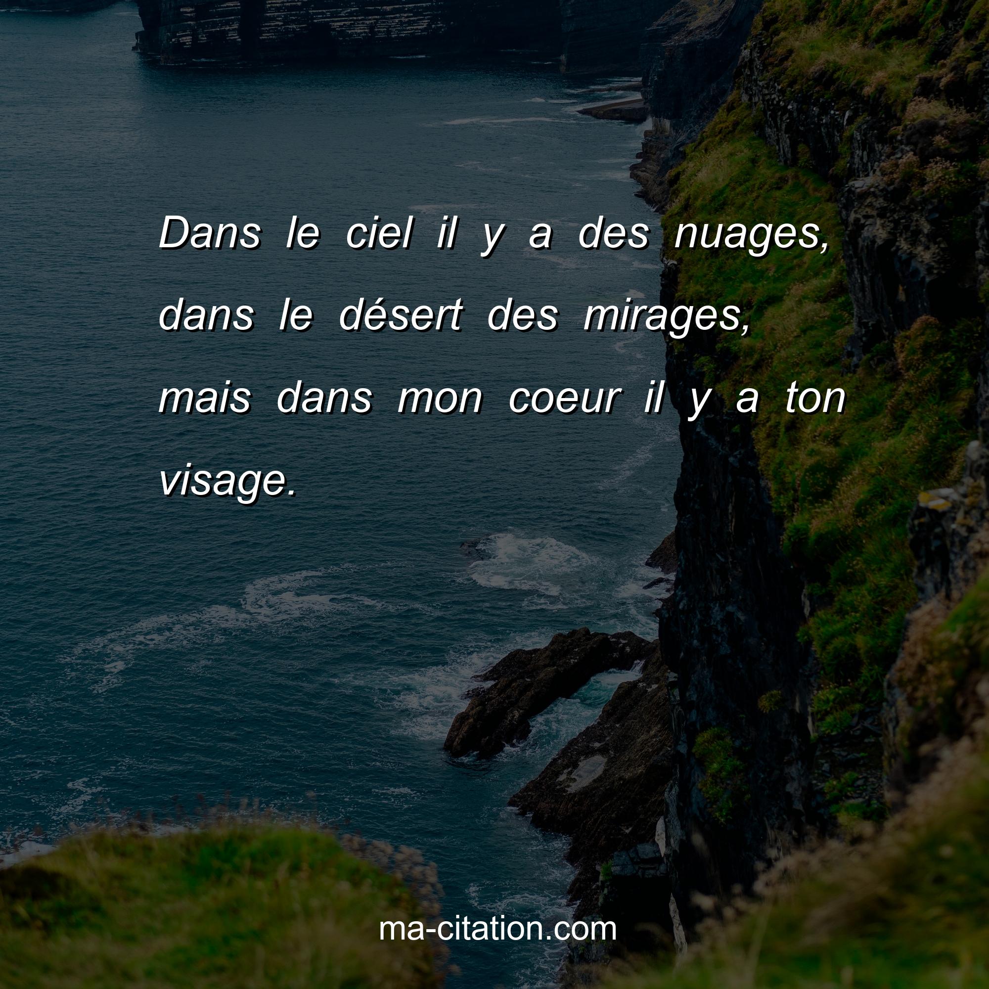 Citation sur l'amour :Dans le ciel il y a des nuages, dans le désert des mirages, mais dans mon coeur il y a ton visage.