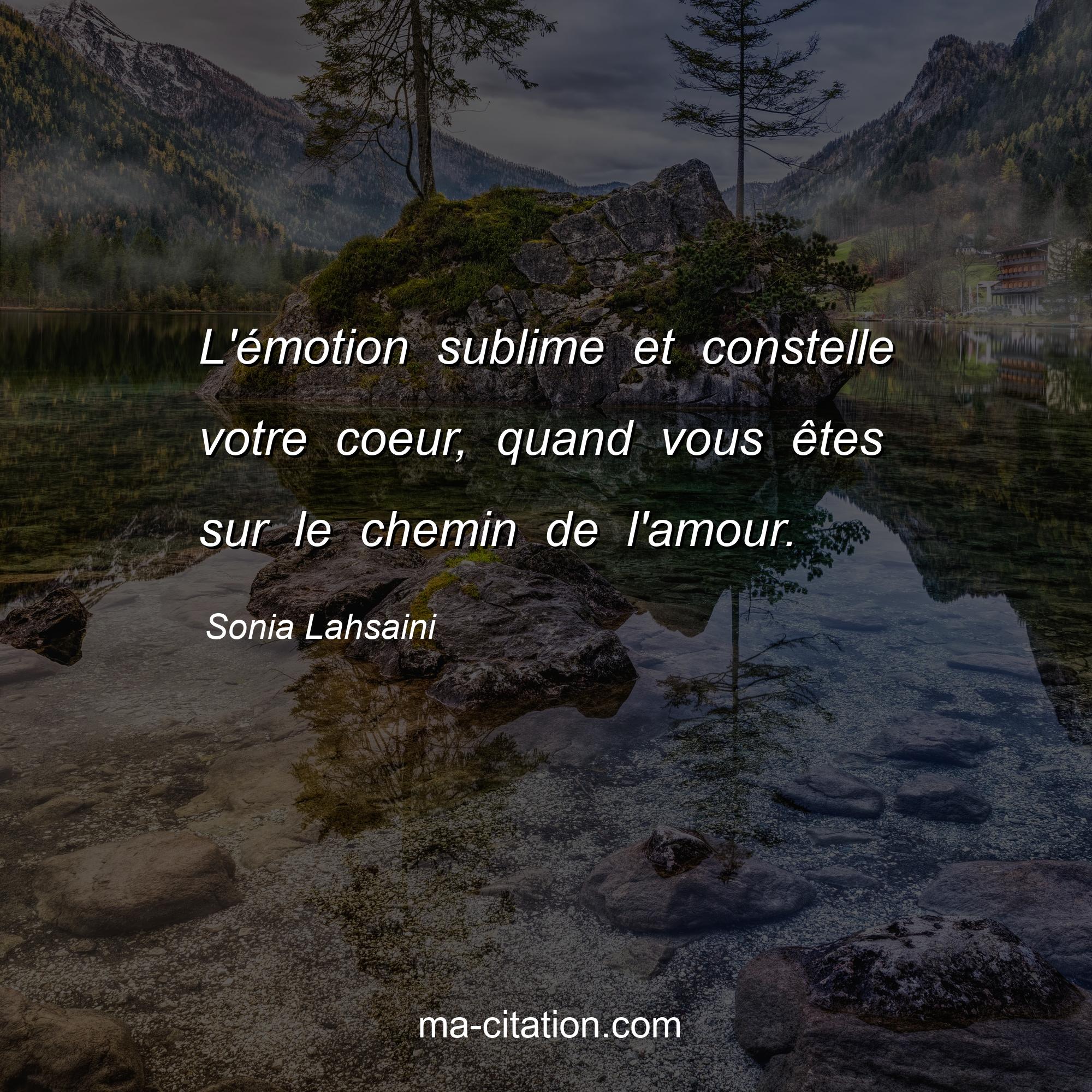 Sonia Lahsaini est l'auteur de la citation sur l'amour "L'émotion sublime et constelle votre coeur, quand vous êtes sur le chemin de l'amour.".