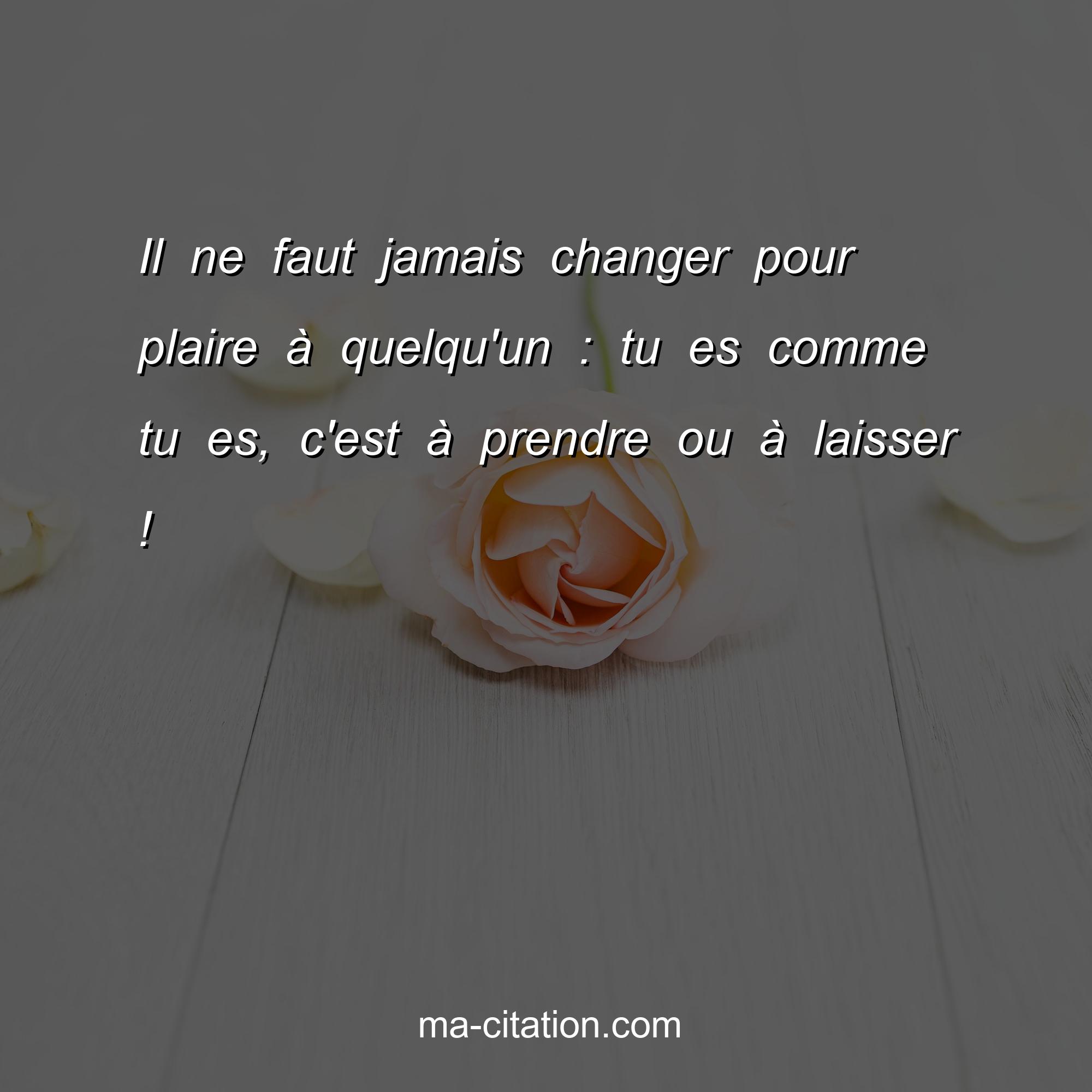 Citation sur l'amour :Il ne faut jamais changer pour plaire à quelqu'un : tu es comme tu es, c'est à prendre ou à laisser !