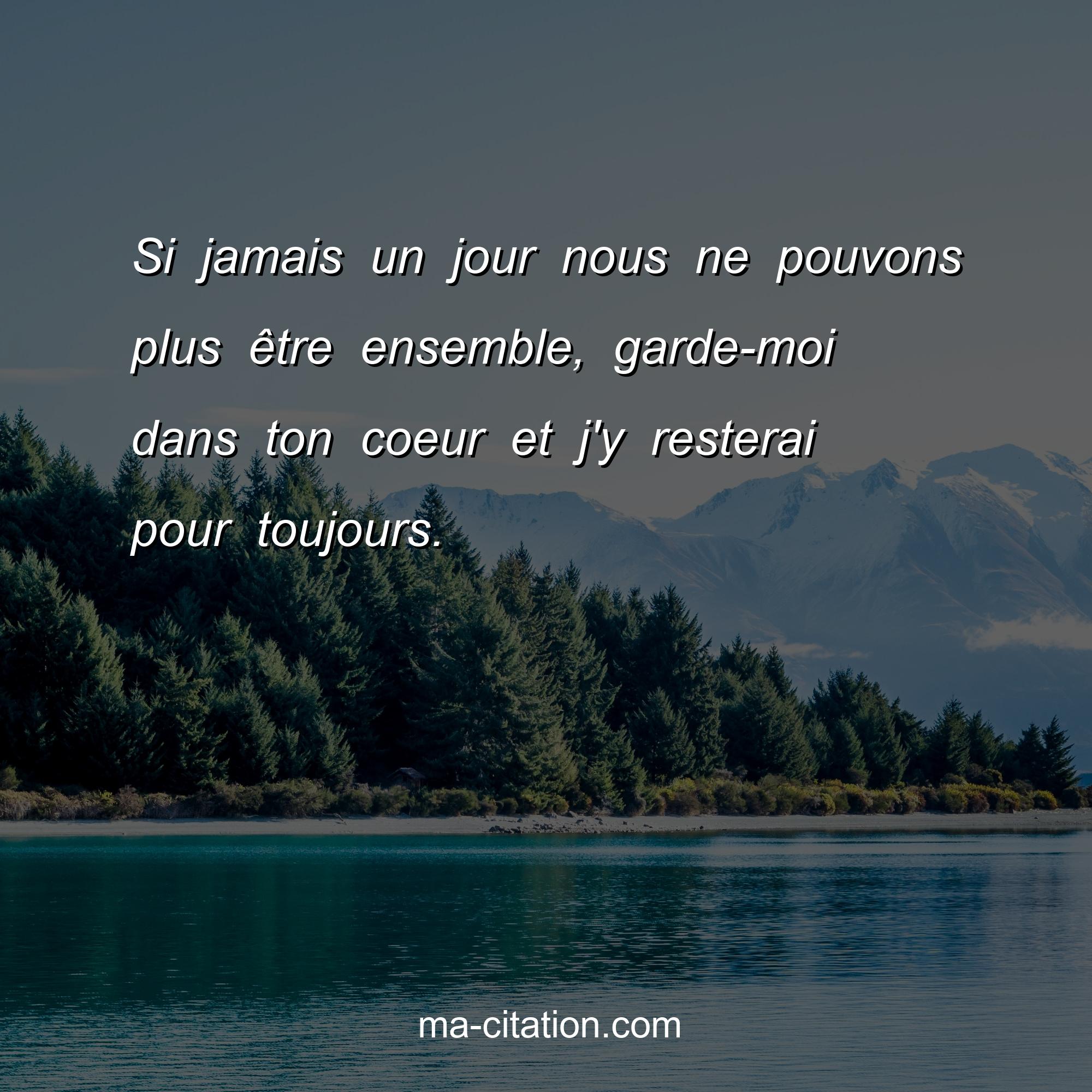 Citation sur l'amour :Si jamais un jour nous ne pouvons plus être ensemble, garde-moi dans ton coeur et j'y resterai pour toujours.
