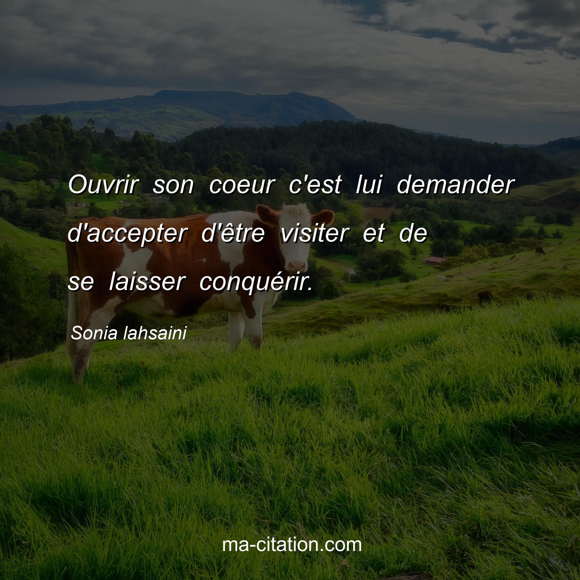 Sonia lahsaini est l'auteur de la citation sur l'amour "Ouvrir son coeur c'est lui demander d'accepter d'être visiter et de se laisser conquérir.".
