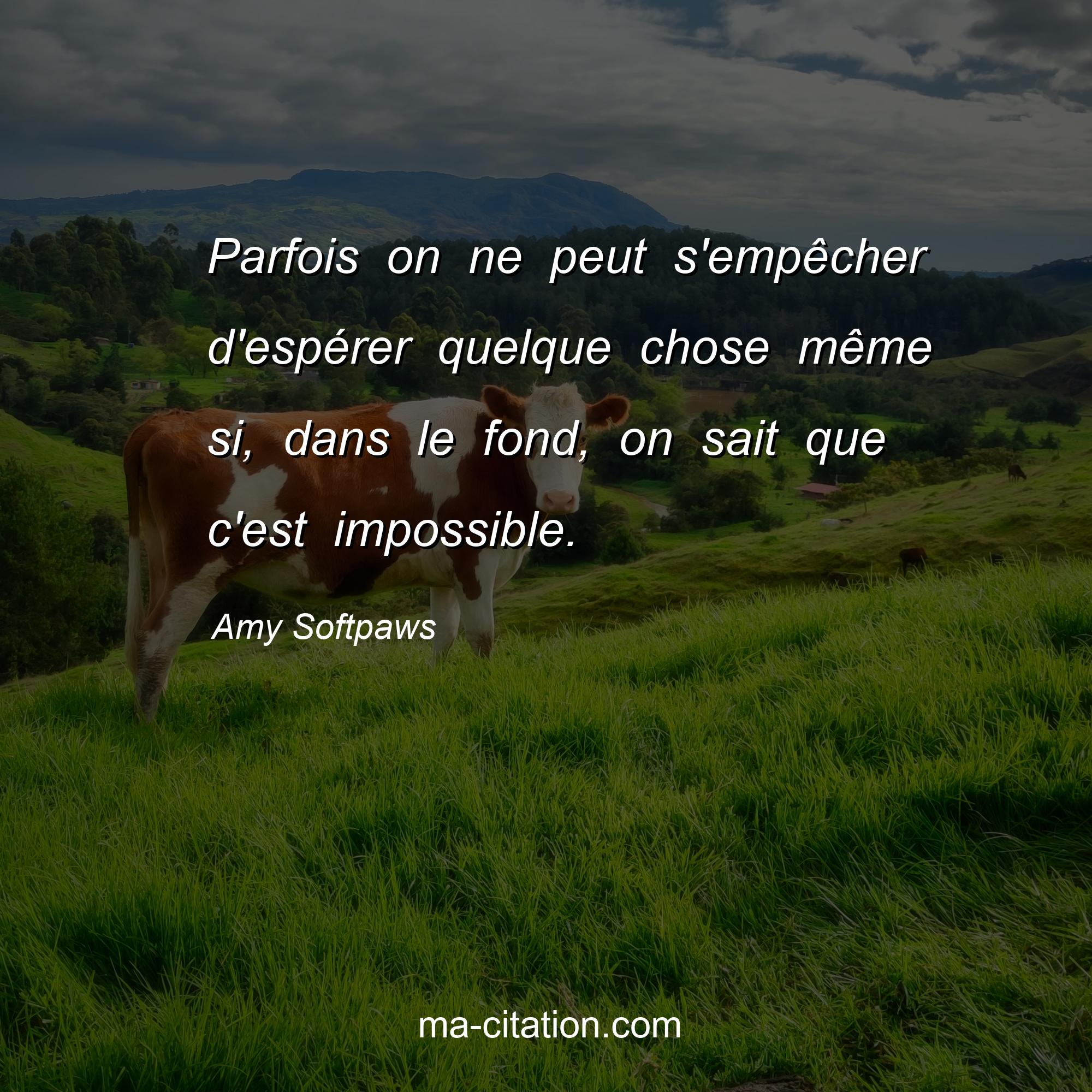 Amy Softpaws est l'auteur de la citation sur l'amour "Parfois on ne peut s'empêcher d'espérer quelque chose même si, dans le fond, on sait que c'est impossible.".