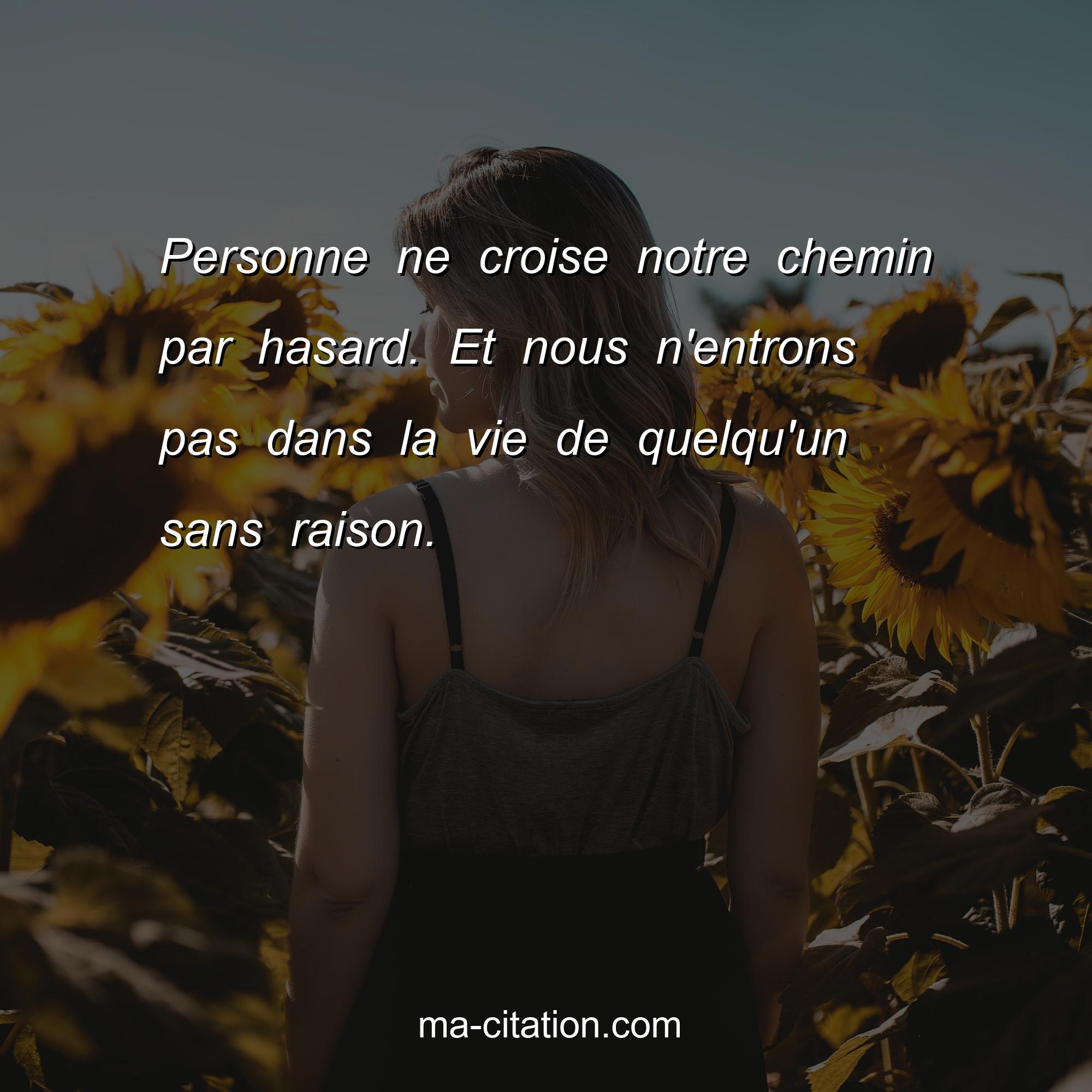 Citation sur l'amour :Personne ne croise notre chemin par hasard. Et nous n'entrons pas dans la vie de quelqu'un sans raison.