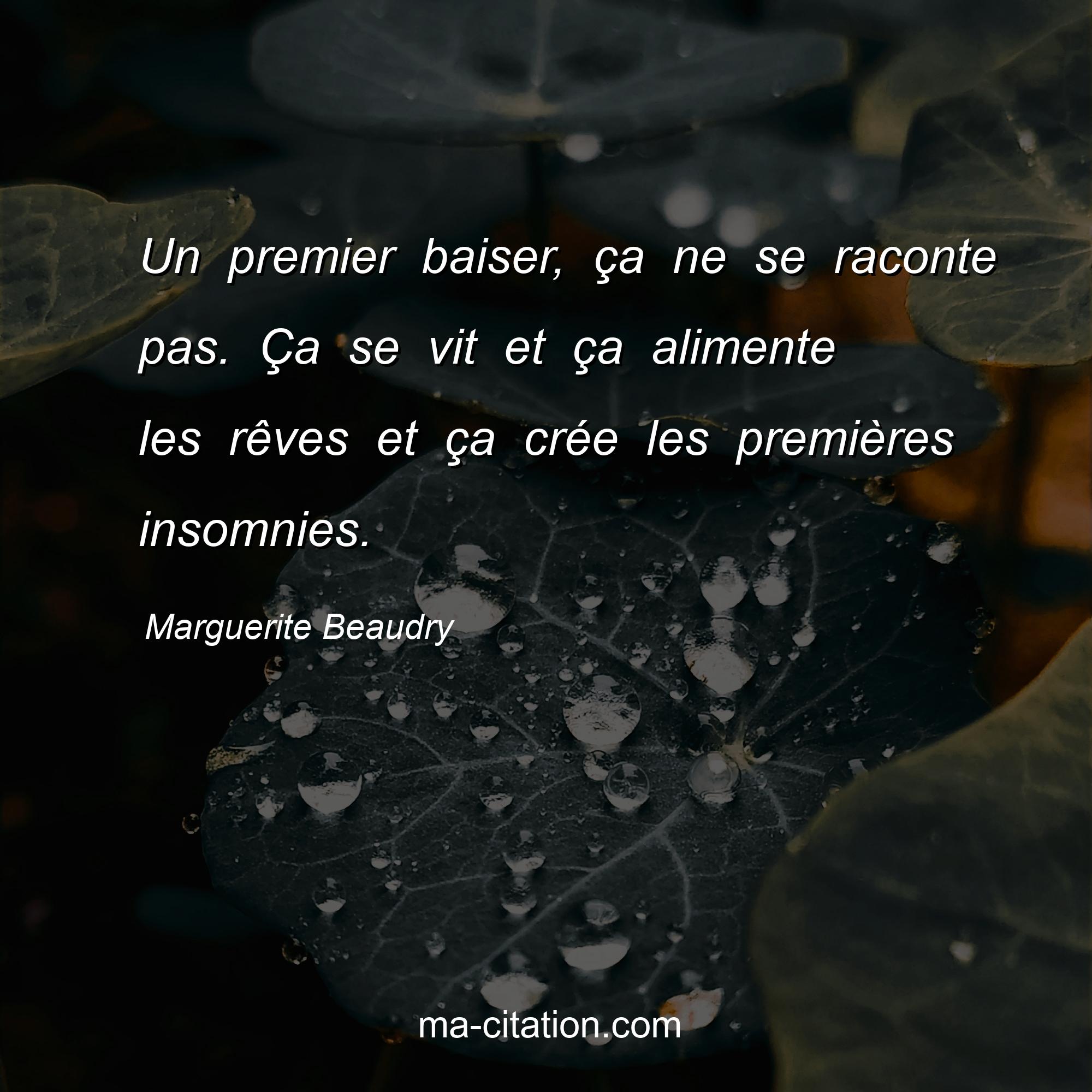 Marguerite Beaudry est l'auteur de la citation sur l'amour "Un premier baiser, ça ne se raconte pas. Ça se vit et ça alimente les rêves et ça crée les premières insomnies.".