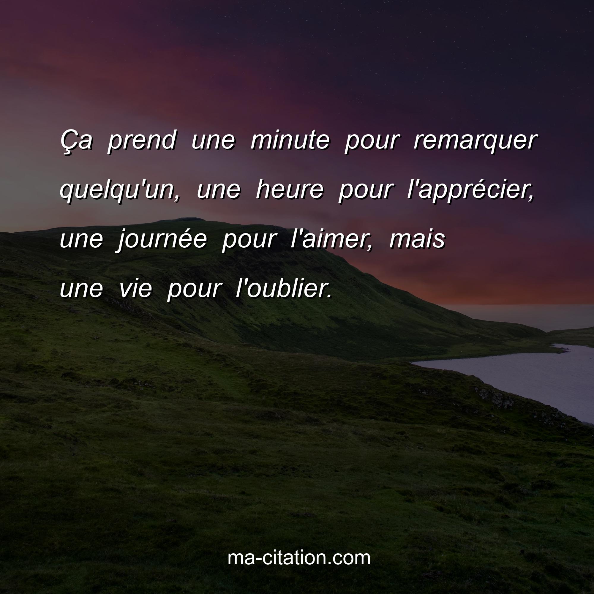 Ça prend une minute pour remarquer quelqu'un, une heure pour l'apprécier, une journée pour l'aimer, mais une vie pour l'oublier.