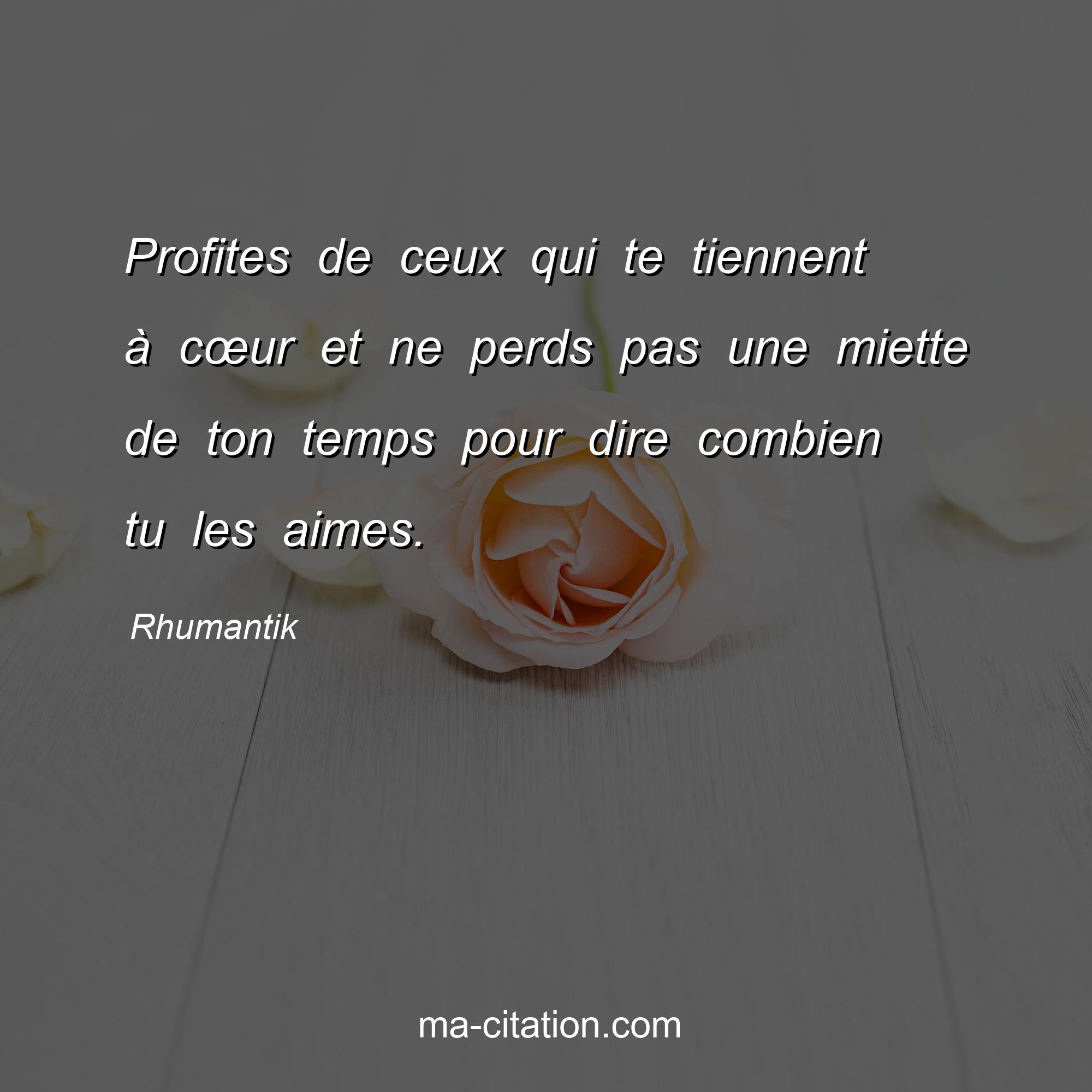 Rhumantik est l'auteur de la citation sur l'amour "Profites de ceux qui te tiennent à cœur et ne perds pas une miette de ton temps pour dire combien tu les aimes.".