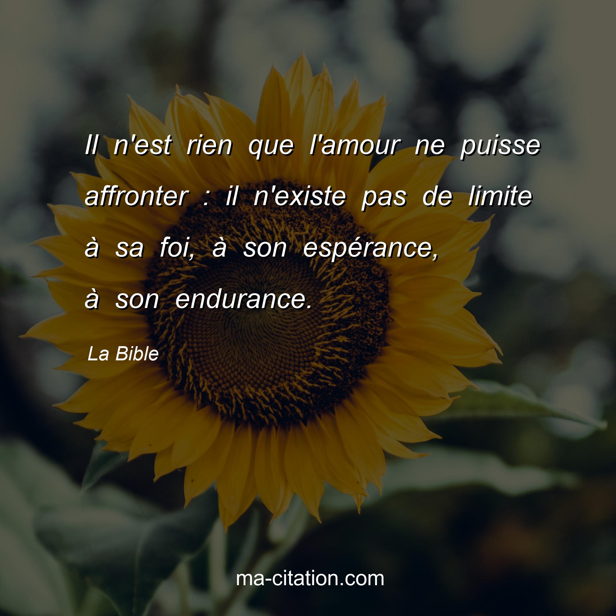La Bible est l'auteur de la citation sur l'amour "Il n'est rien que l'amour ne puisse affronter : il n'existe pas de limite à sa foi, à son espérance, à son endurance.".