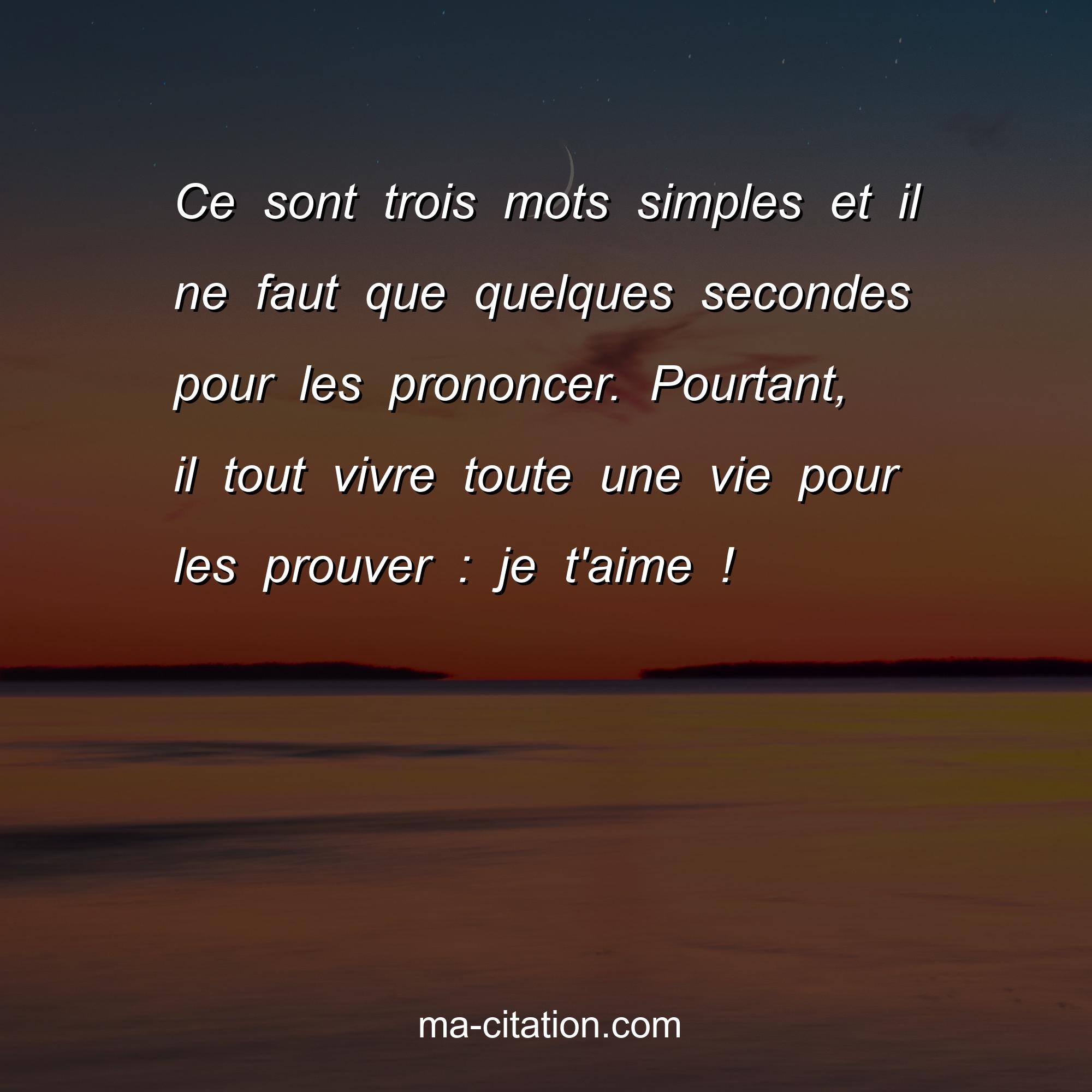 Citation sur l'amour :Ce sont trois mots simples et il ne faut que quelques secondes pour les prononcer. Pourtant, il tout vivre toute une vie pour les prouver : je t'aime !
