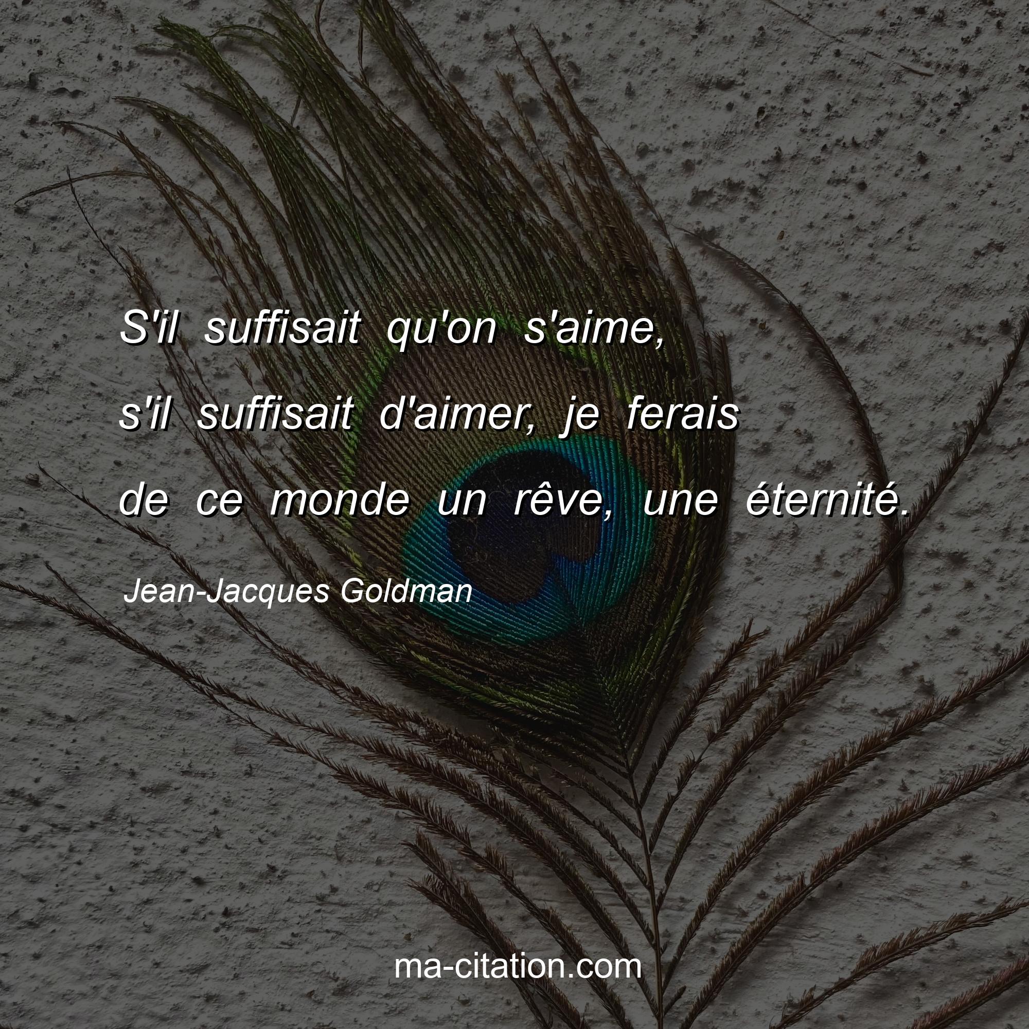 Citation sur l'amour de Jean-Jacques Goldman :S'il suffisait qu'on s'aime, s'il suffisait d'aimer, je ferais de ce monde un rêve, une éternité.