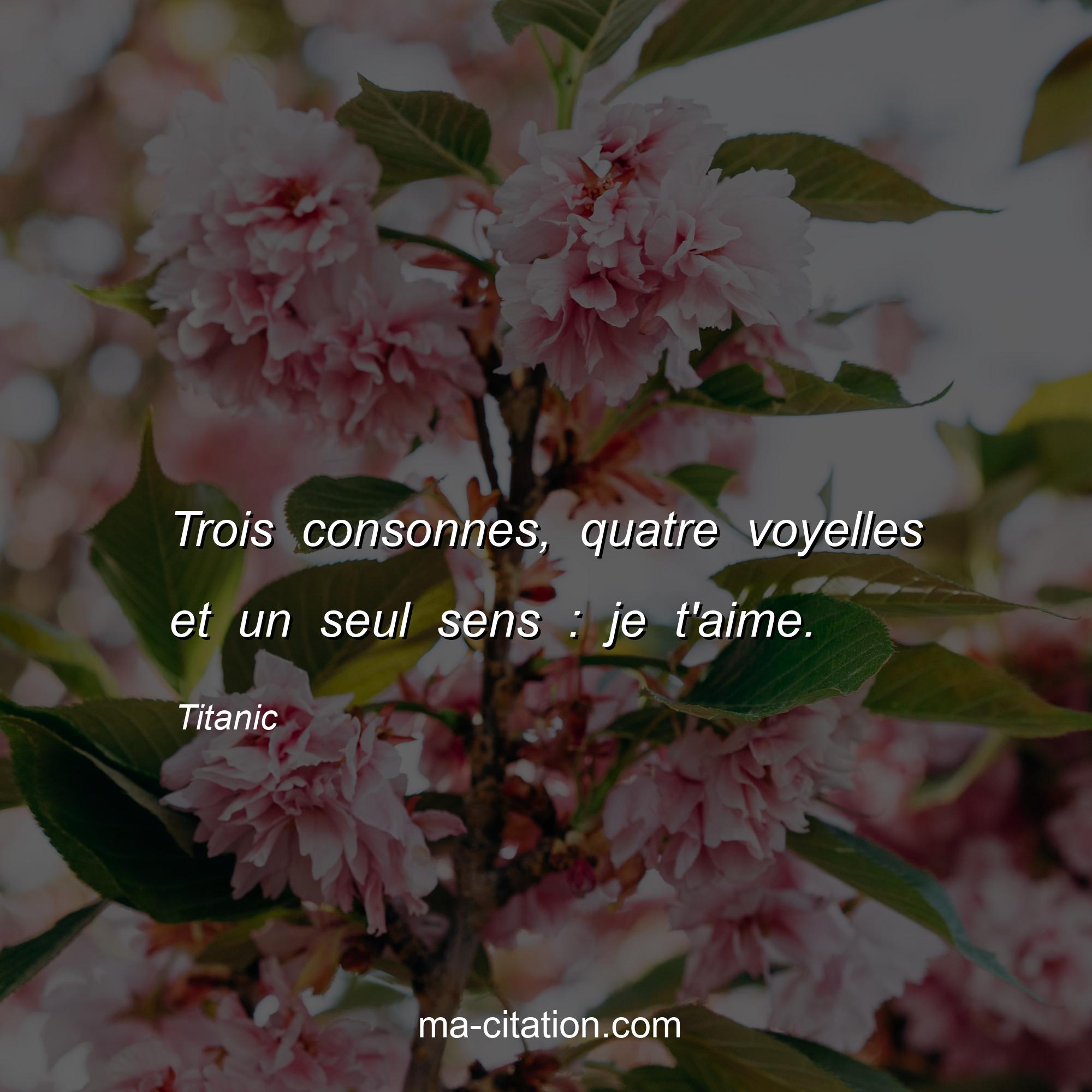 Citation sur l'amour de Titanic :Trois consonnes, quatre voyelles et un seul sens : je t'aime.
