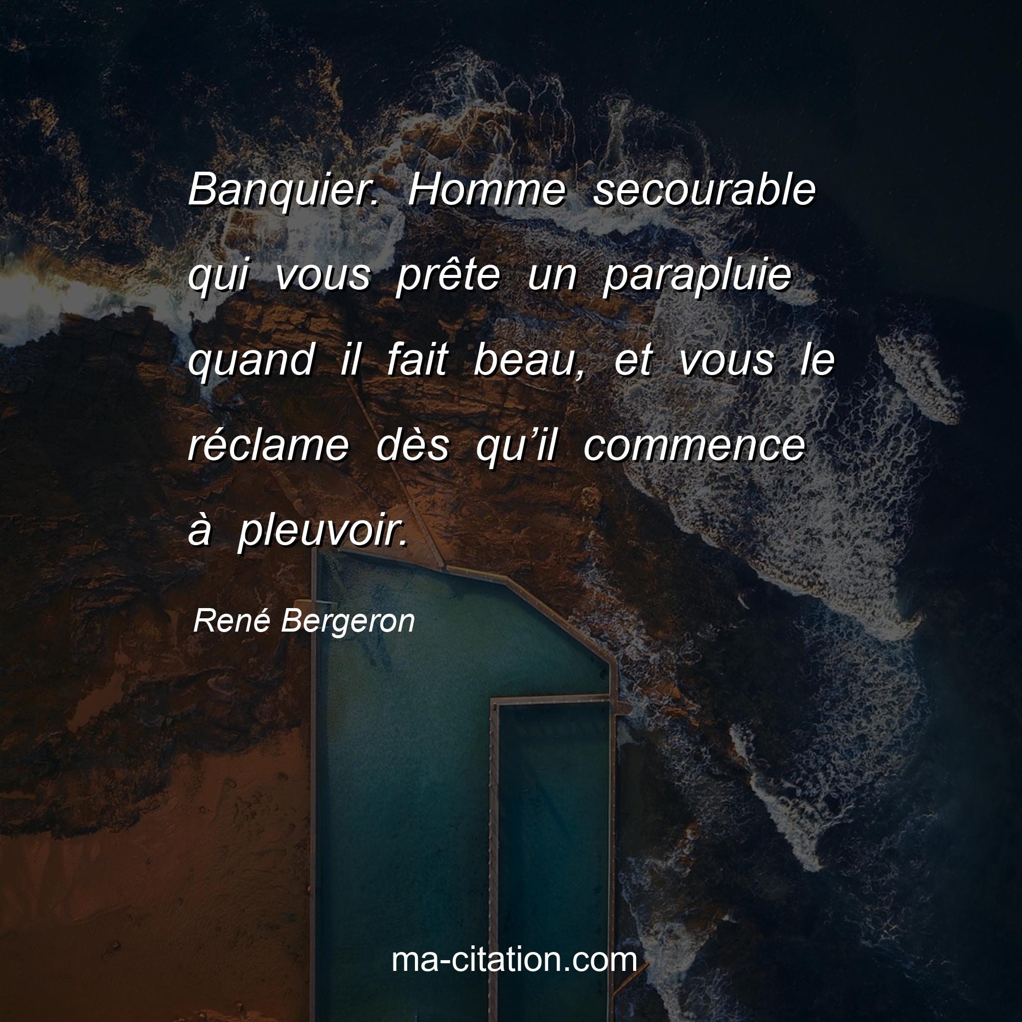 Citation drôles de René Bergeron :Banquier. Homme secourable qui vous prête un parapluie quand il fait beau, et vous le réclame dès qu’il commence à pleuvoir.