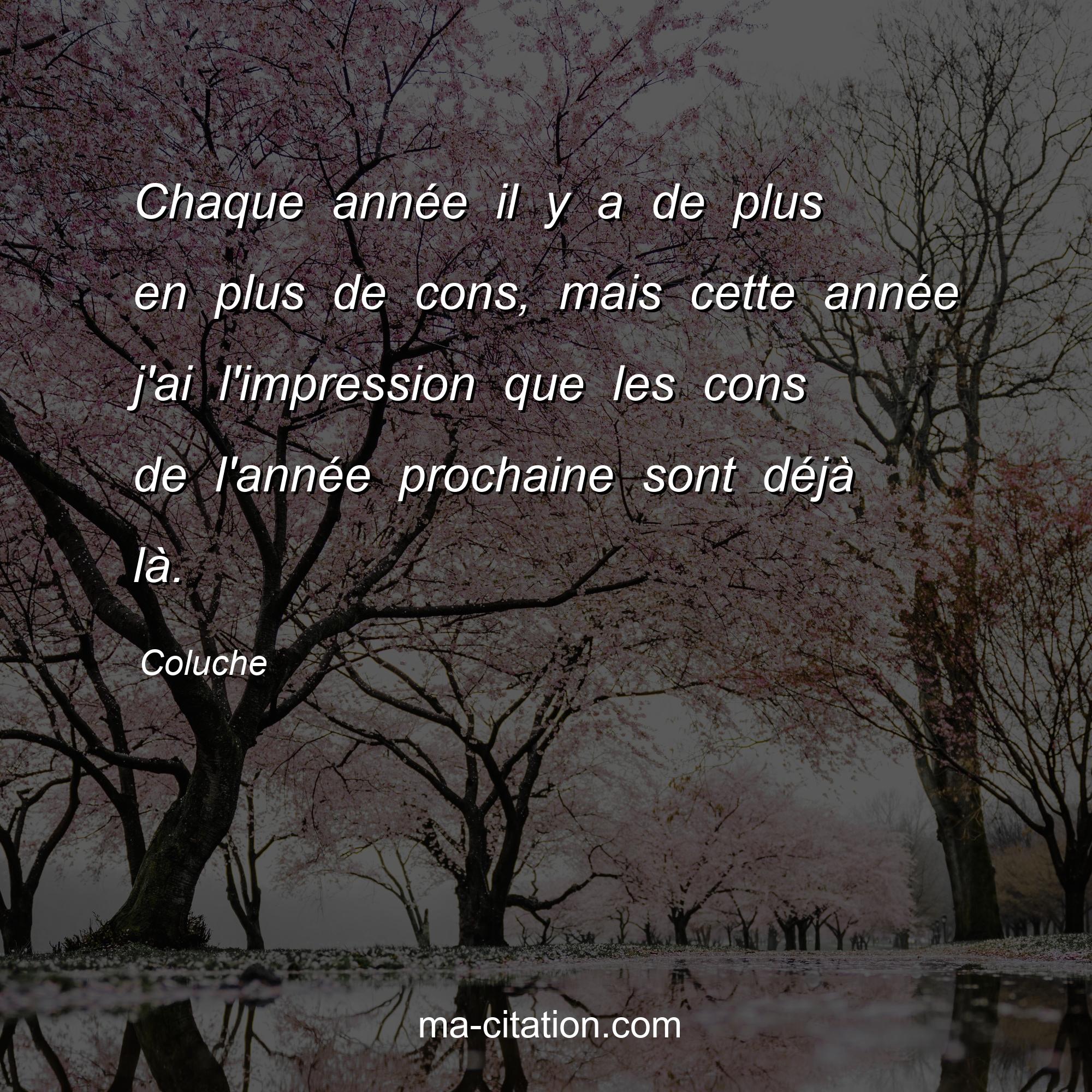 Coluche est l'auteur de la citation drôles "Chaque année il y a de plus en plus de cons, mais cette année j'ai l'impression que les cons de l'année prochaine sont déjà là .".
