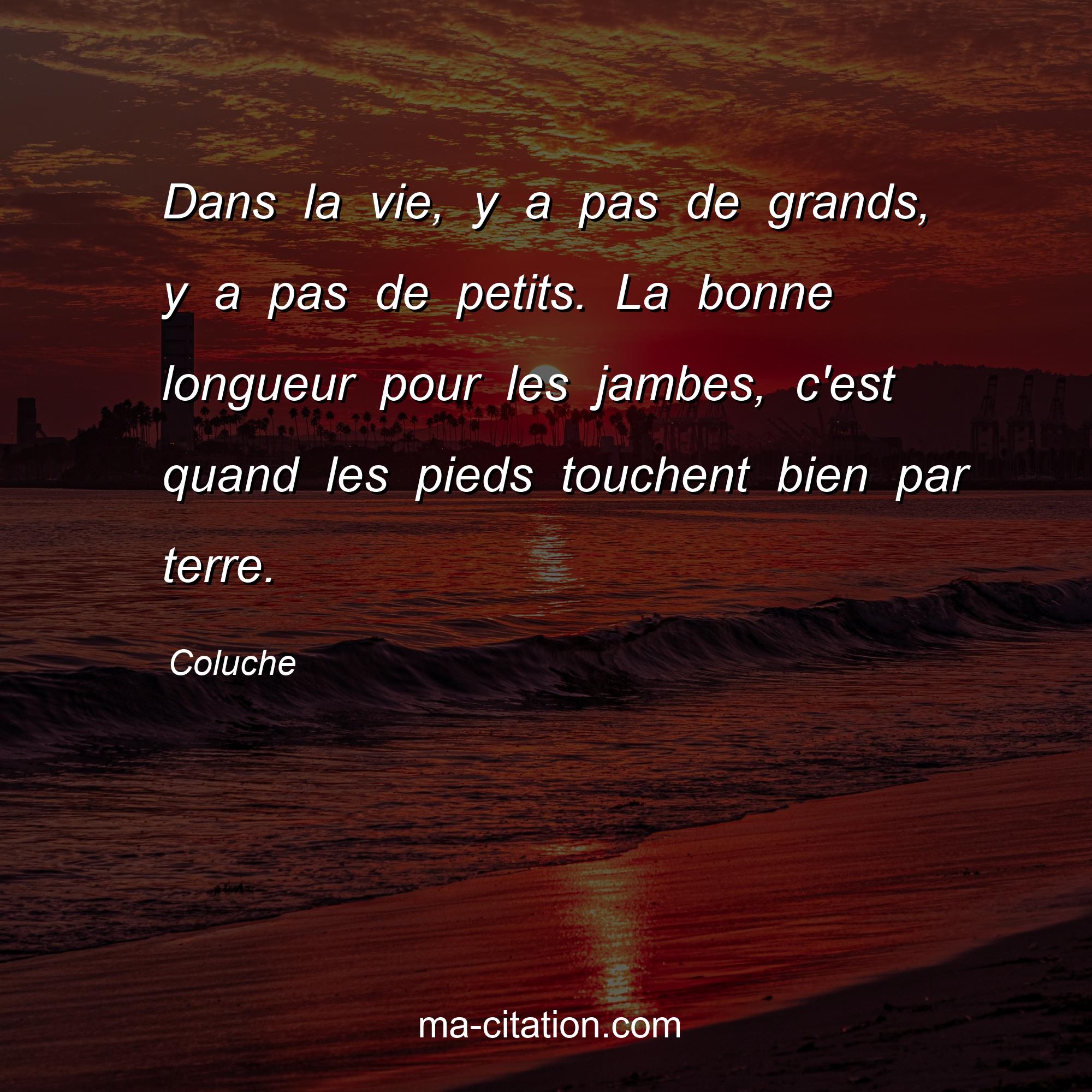 Citation drôles de Coluche :Dans la vie, y a pas de grands, y a pas de petits. La bonne longueur pour les jambes, c'est quand les pieds touchent bien par terre.