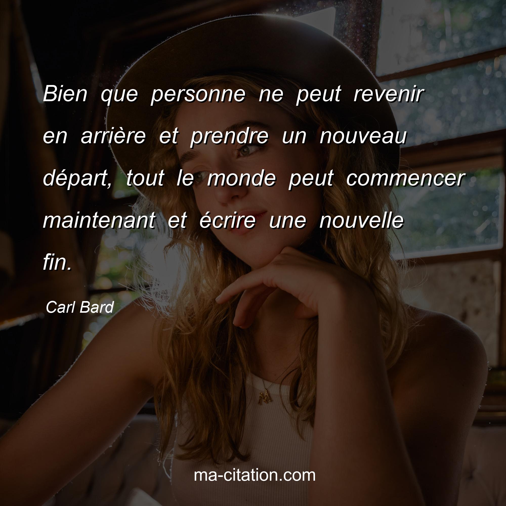 Carl Bard est l'auteur de la citation sur la motivation "Bien que personne ne peut revenir en arrière et prendre un nouveau départ, tout le monde peut commencer maintenant et écrire une nouvelle fin.".