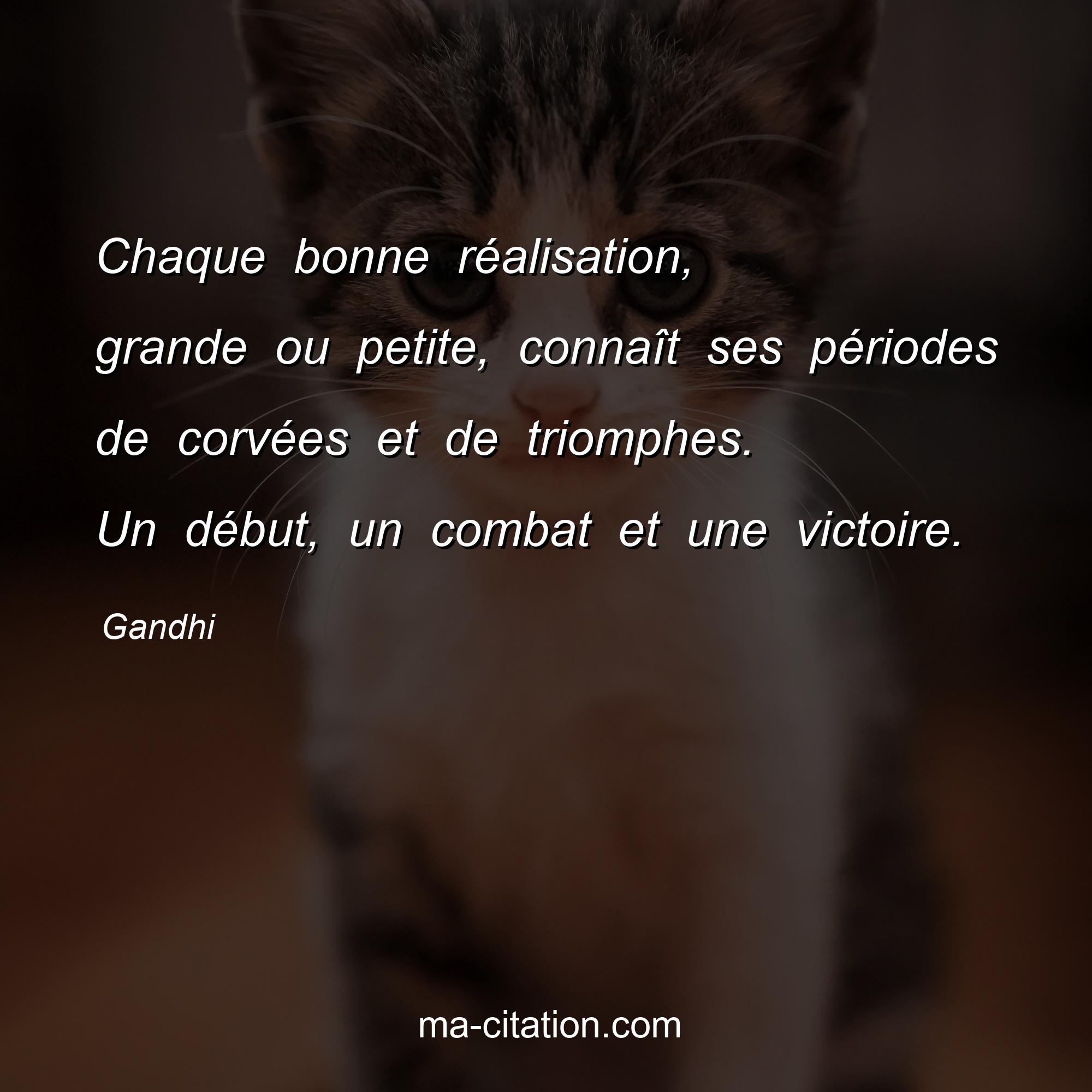 Citation sur la motivation de Gandhi :Chaque bonne réalisation, grande ou petite, connaît ses périodes de corvées et de triomphes. Un début, un combat et une victoire.