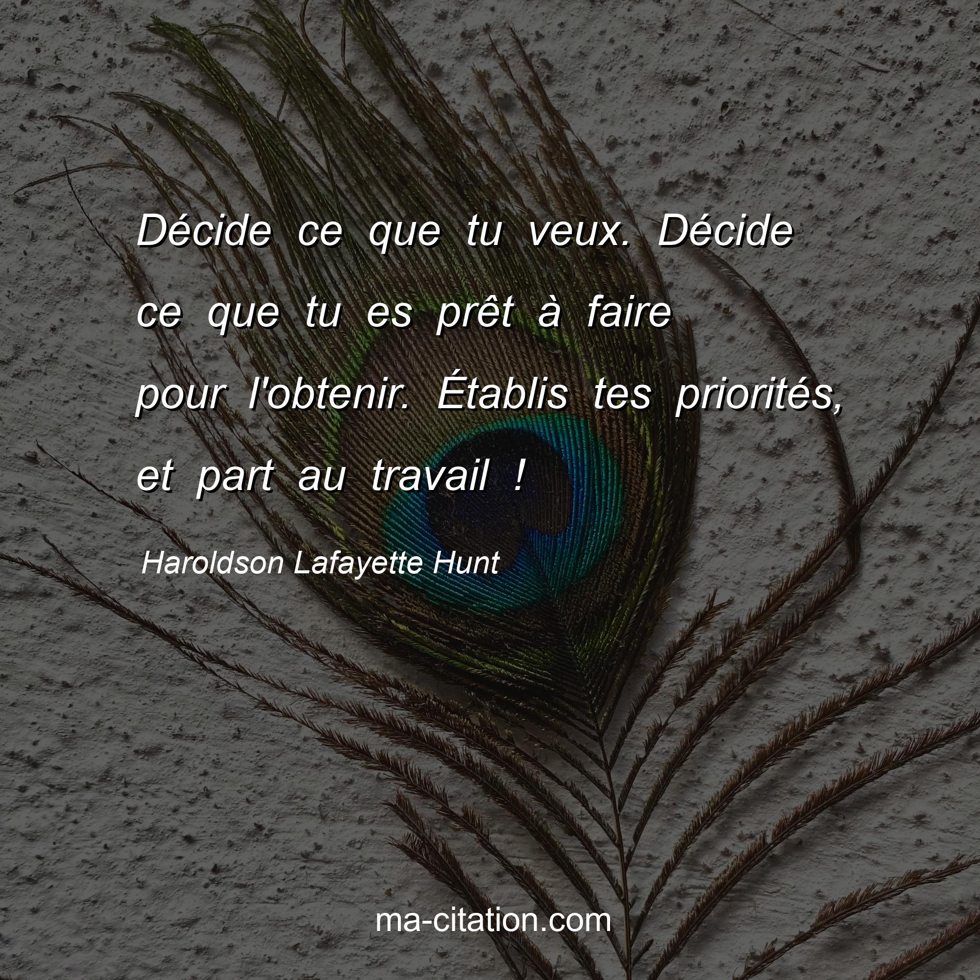 Citation sur la motivation de Haroldson Lafayette Hunt :Décide ce que tu veux. Décide ce que tu es prêt à faire pour l'obtenir. Établis tes priorités, et part au travail !
