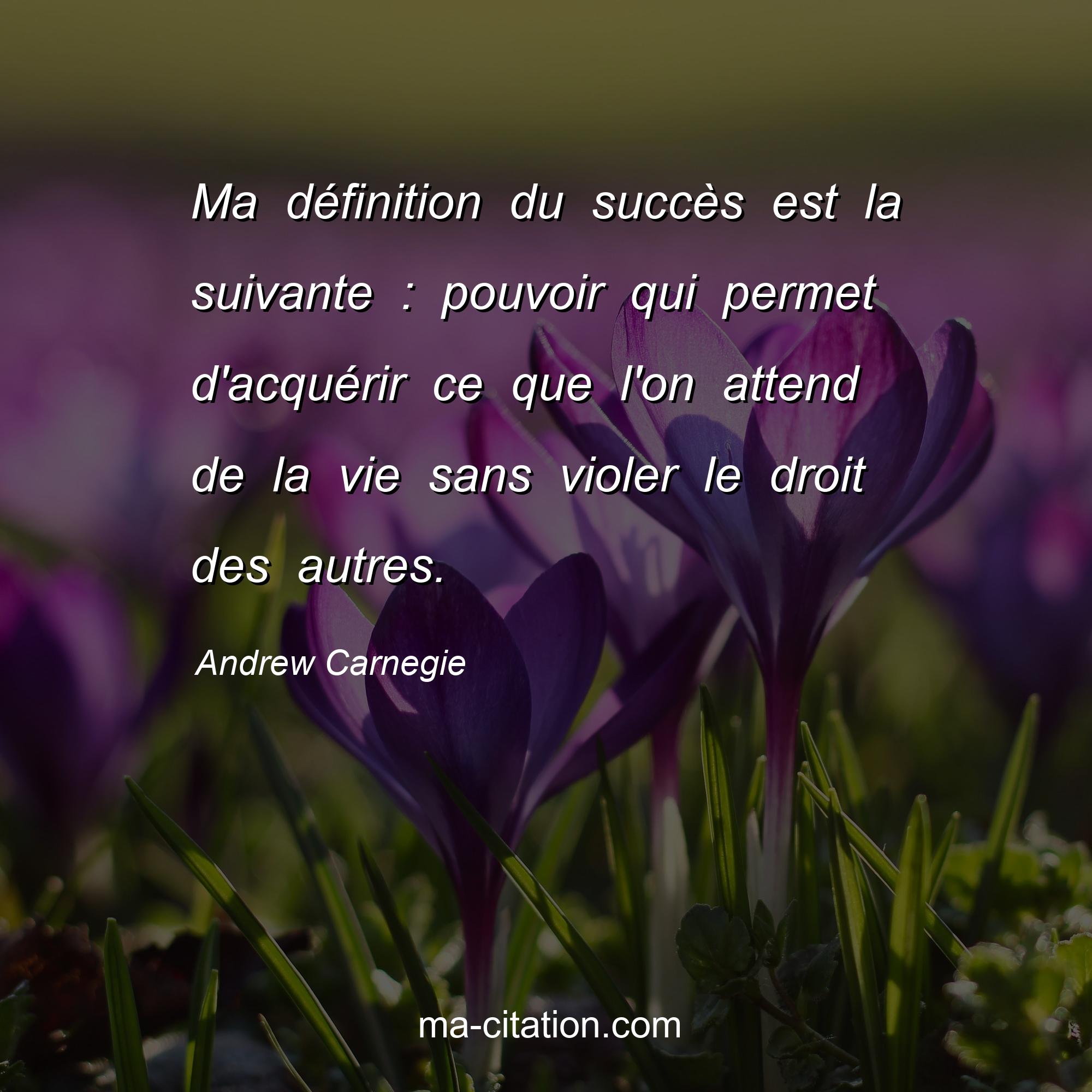 Citation sur la motivation d'Andrew Carnegie :Ma définition du succès est la suivante : pouvoir qui permet d'acquérir ce que l'on attend de la vie sans violer le droit des autres.