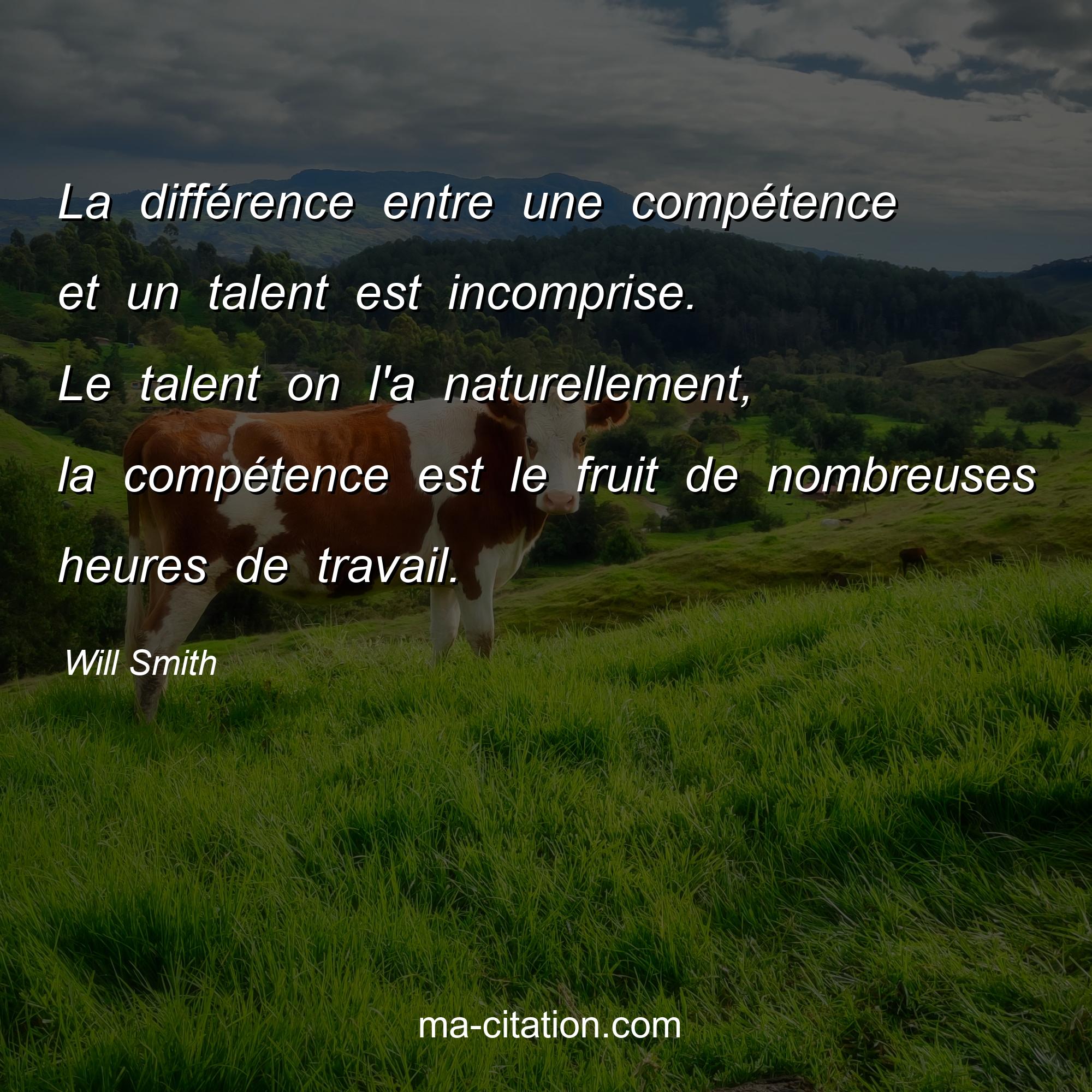 Citation sur la motivation de Will Smith :La différence entre une compétence et un talent est incomprise. Le talent on l'a naturellement, la compétence est le fruit de nombreuses heures de travail.